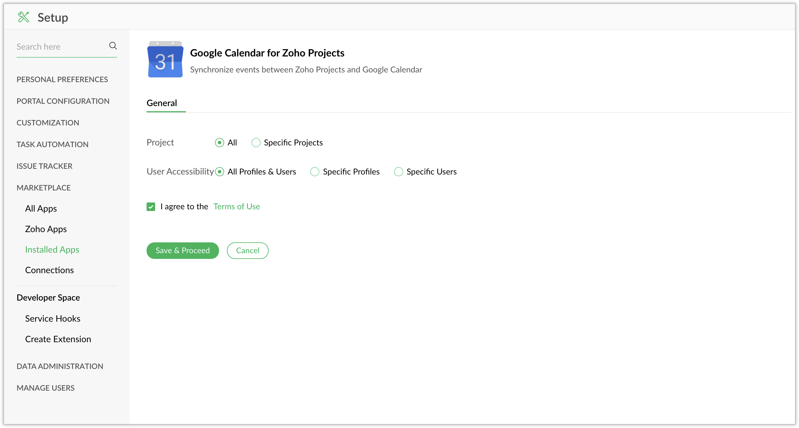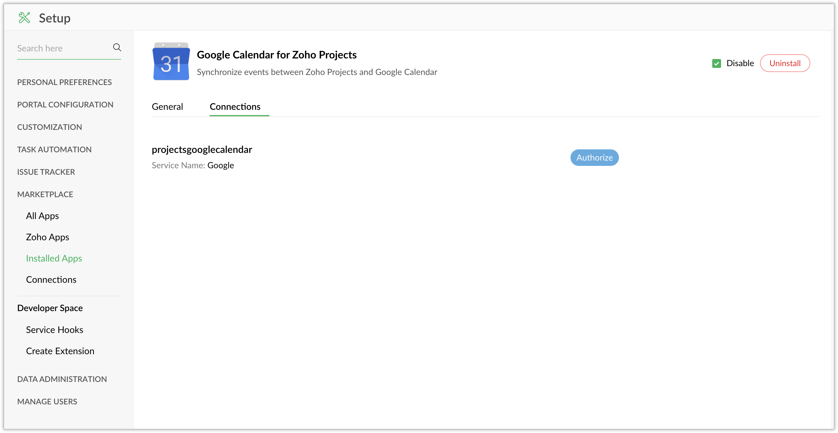 - Cliquez sur Google Calendar pour Zoho Projects.