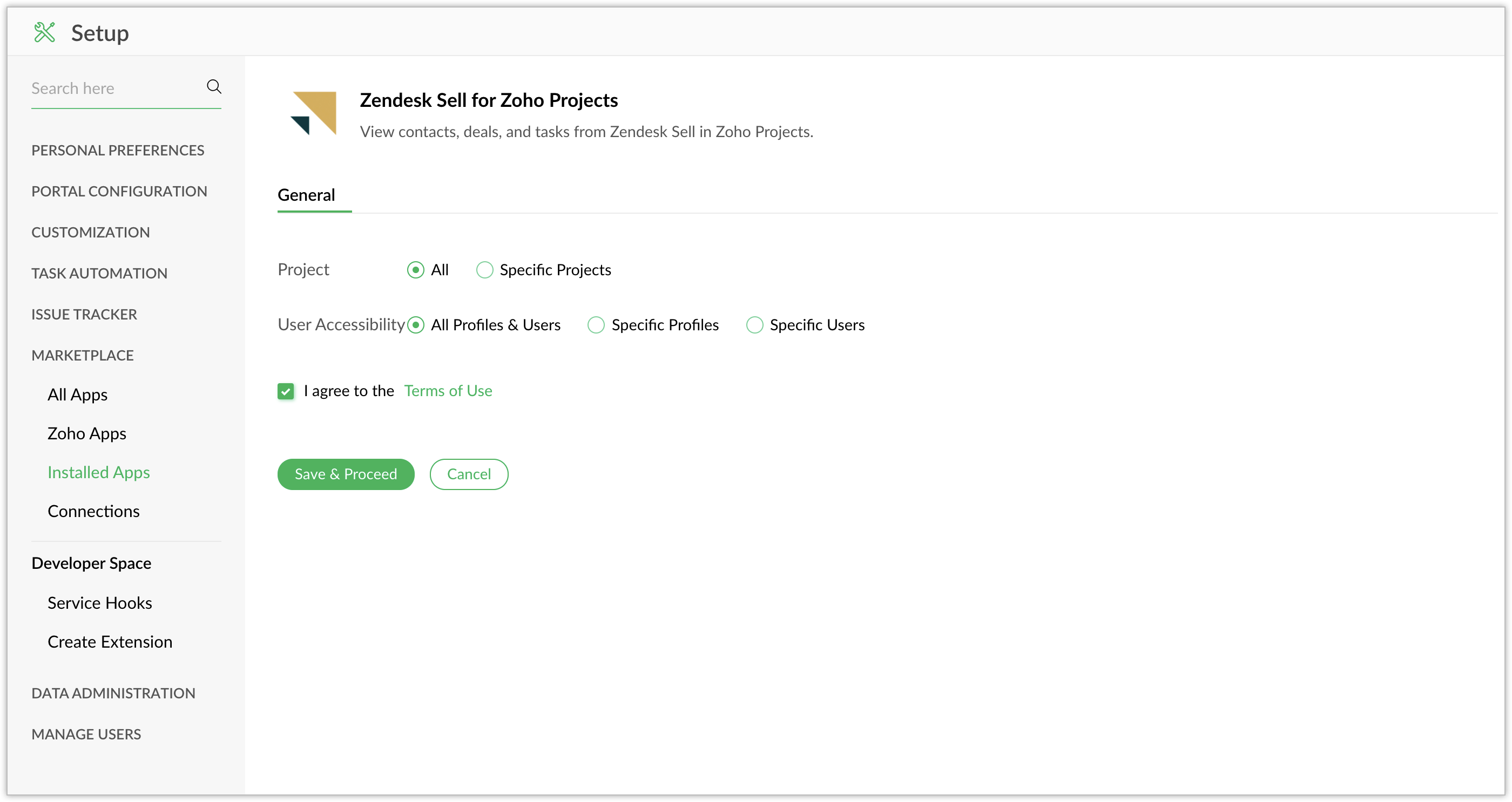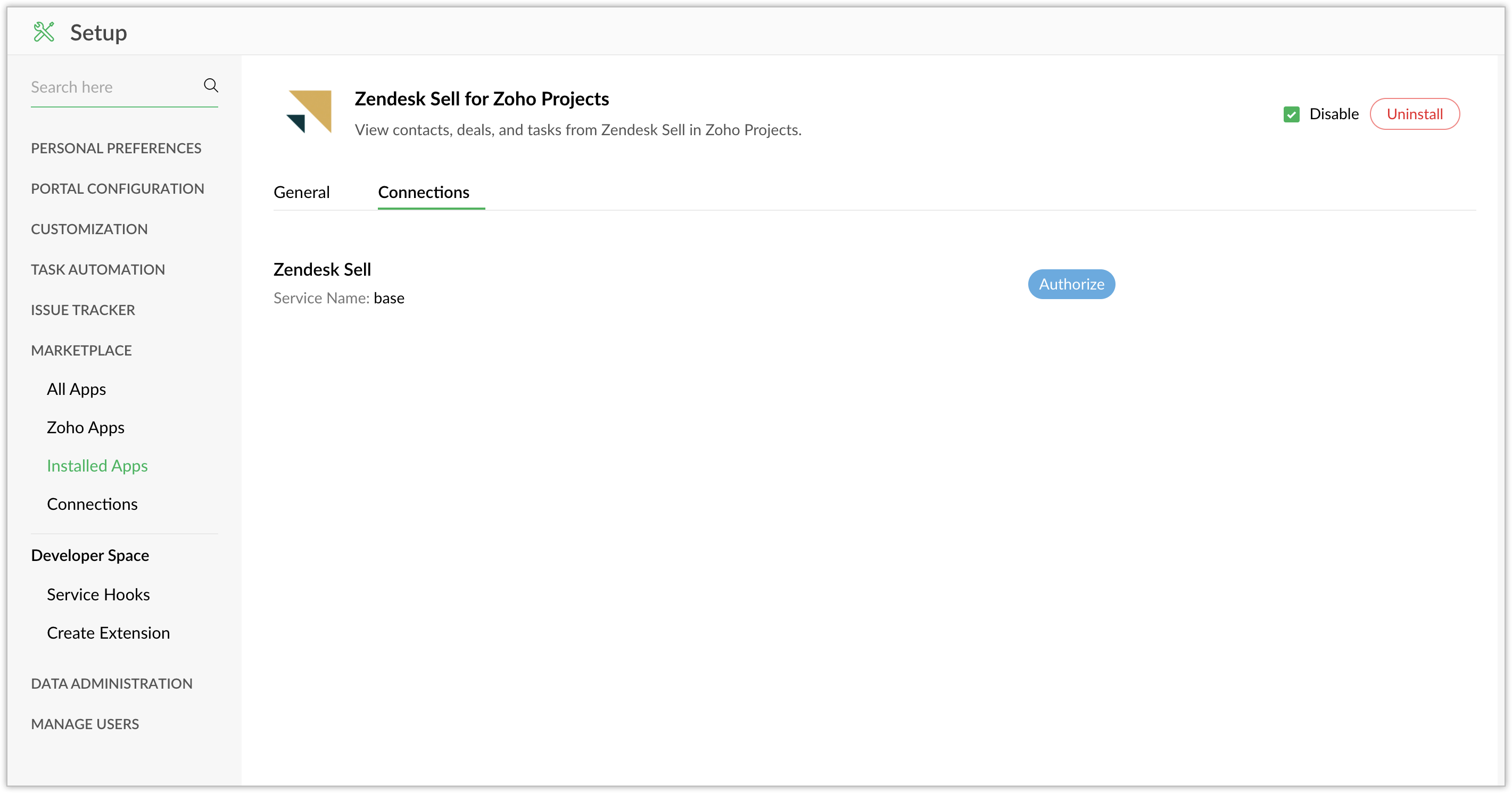- Cliquez sur Zendesk Sell pour Zoho Projects.