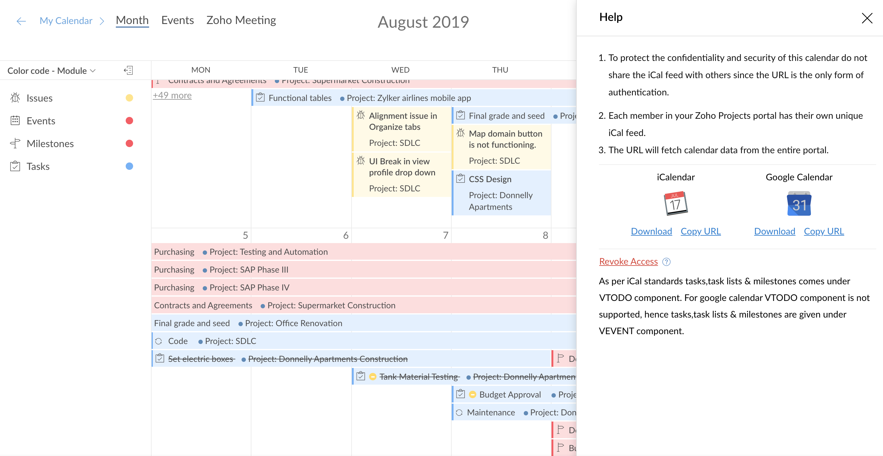 Les événements de projet tels que les tâches, les milestones et les réunions de Zoho Projects s'affichent automatiquement dans votre calendrier Google.