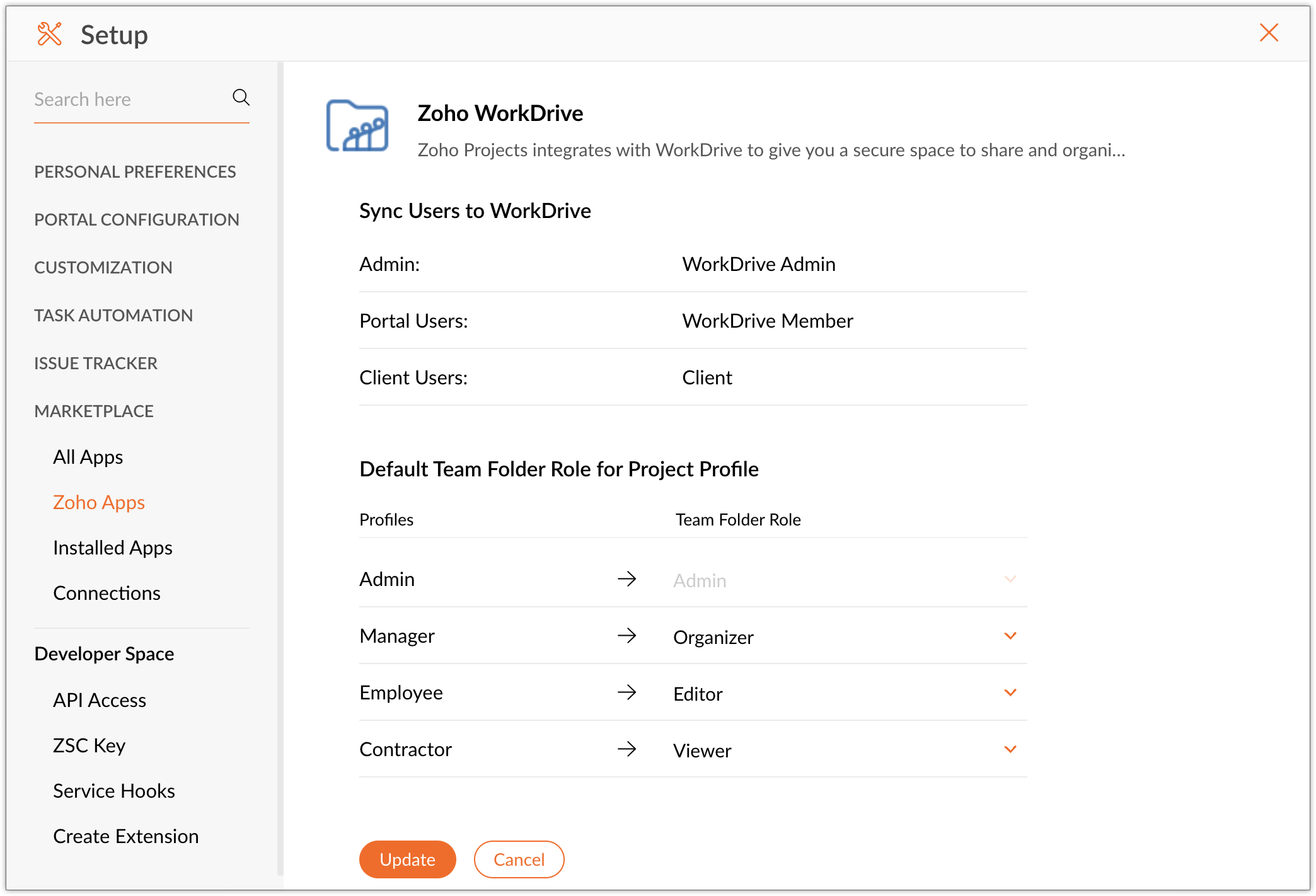 - Sélectionnez les rôles WorkDrive par défaut à mapper avec les profils dans Zoho Projects.