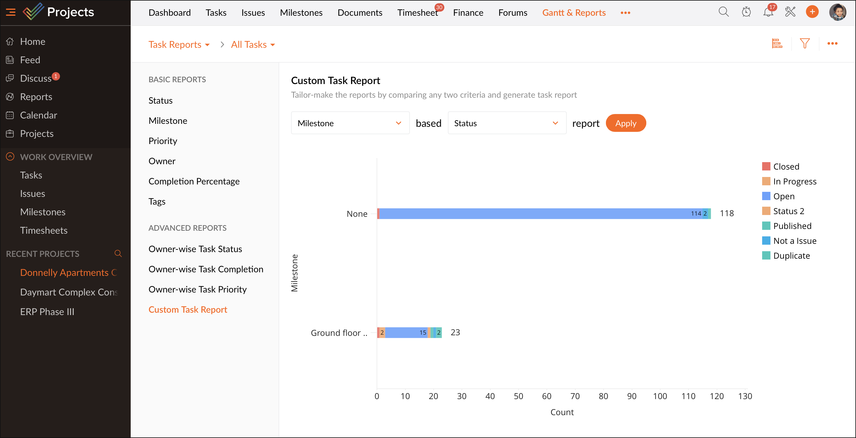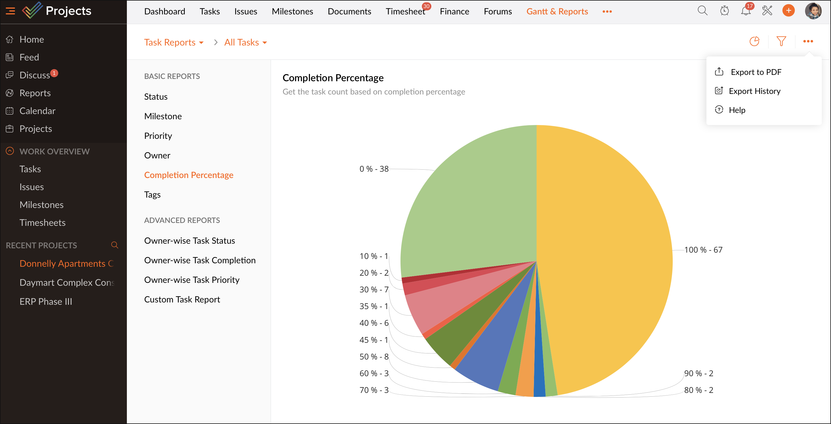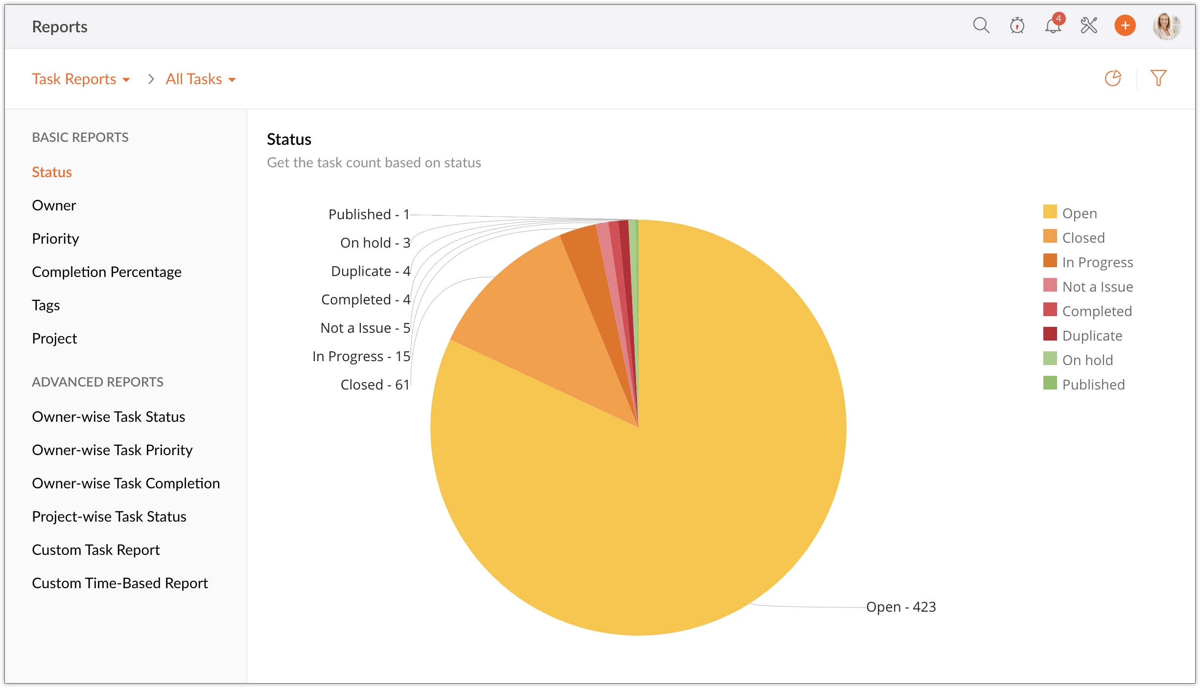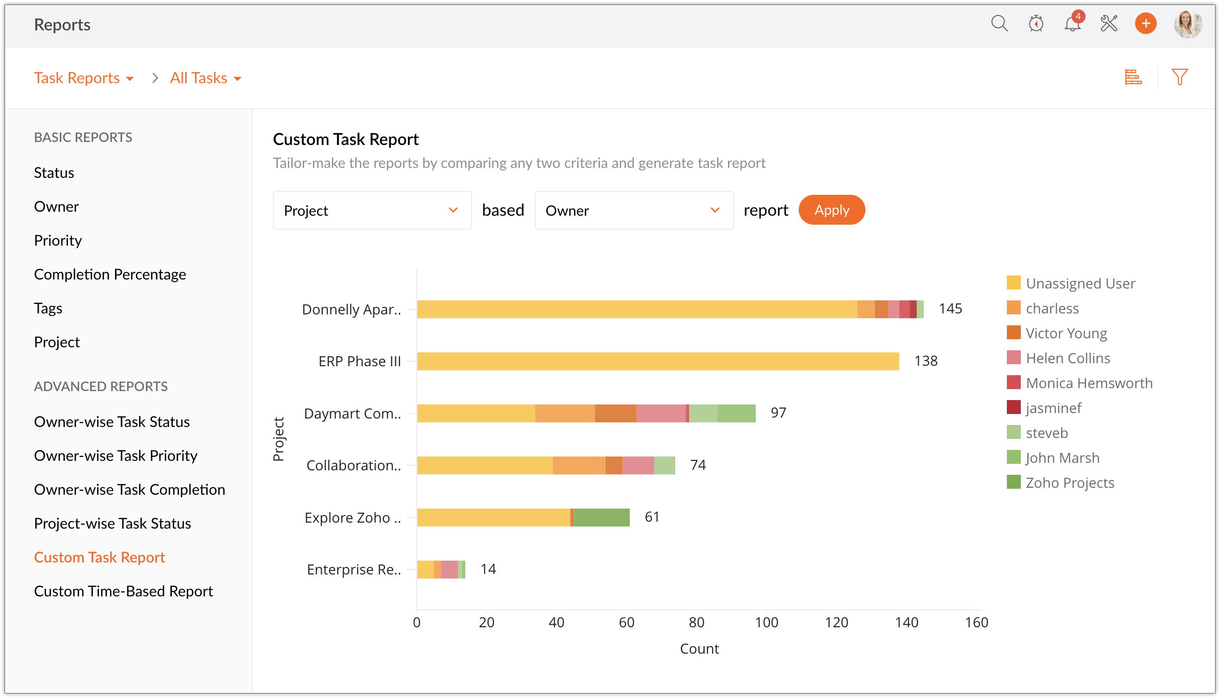 - Les rapports avancés vous donnent le nombre de tâches par propriétaire, par statut, priorité ou achèvement. Vous pouvez également créer un Rapport de tâches personnalisé en fonction de différents critères.