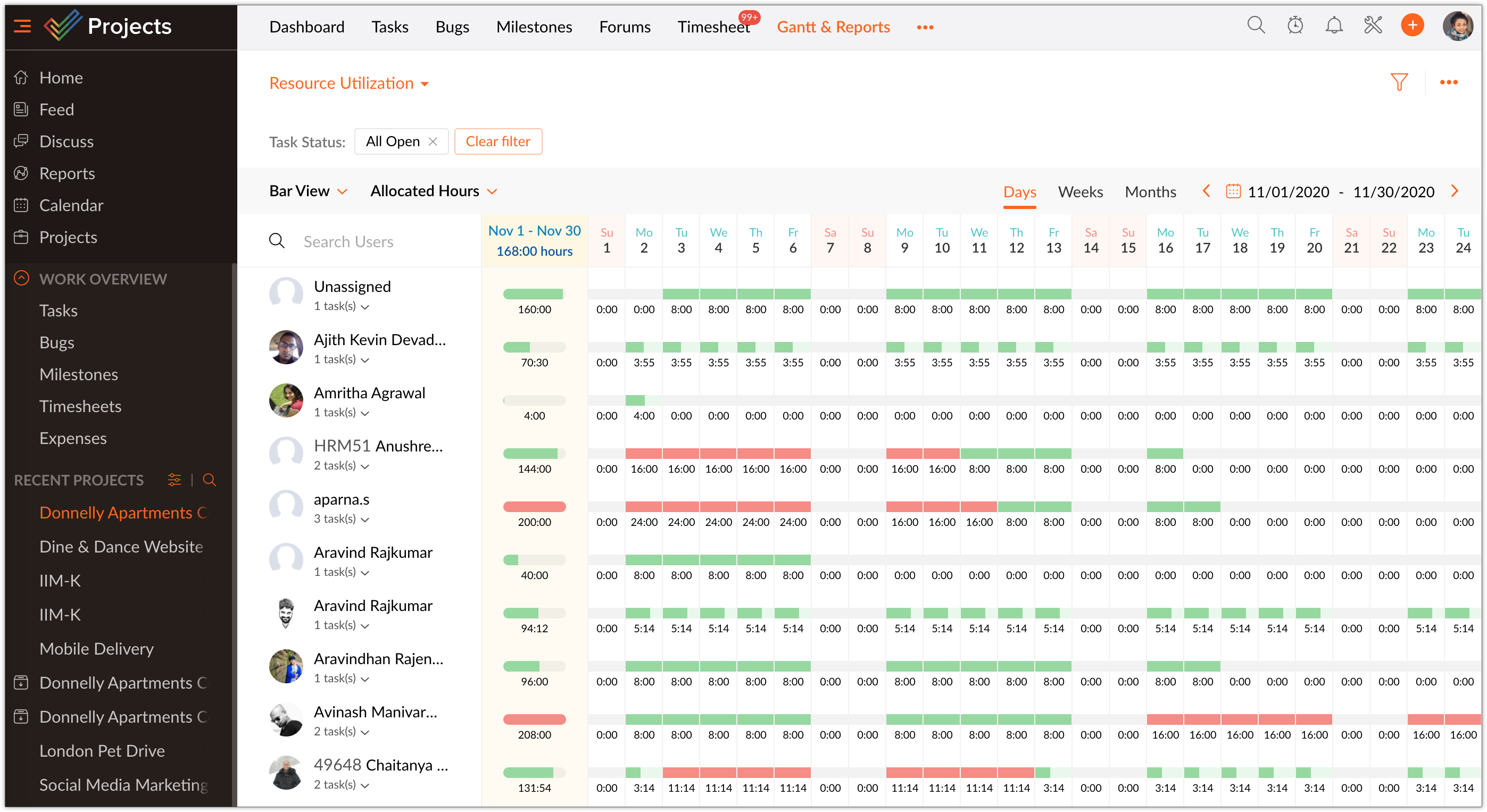 Le diagramme d'utilisation des ressources montre visuellement le travail alloué en heures et en pourcentage. Le temps d'inactivité est représenté. Lorsqu'une ressource est surchargée, vous pouvez l'attribuer soit à une autre ressource, soit à un autre jour avec des heures de travail disponibles. Vous pouvez ajouter directement des tâches sur le diagramme pour n'importe quel utilisateur sélectionné. Recherchez des utilisateurs pour afficher rapidement leur charge de travail.