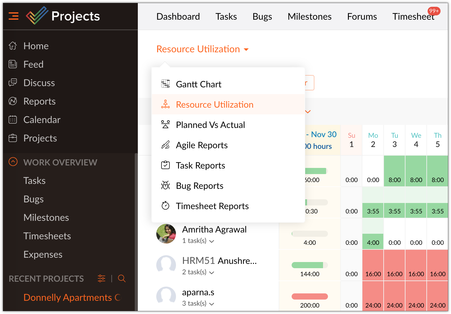 Utilisation des ressources. Ici, vous pouvez afficher les données de tous les projets de votre entreprise. Si vous souhaitez afficher les résultats d'un projet spécifique ou d'un ensemble spécifique de projets, cliquez sur