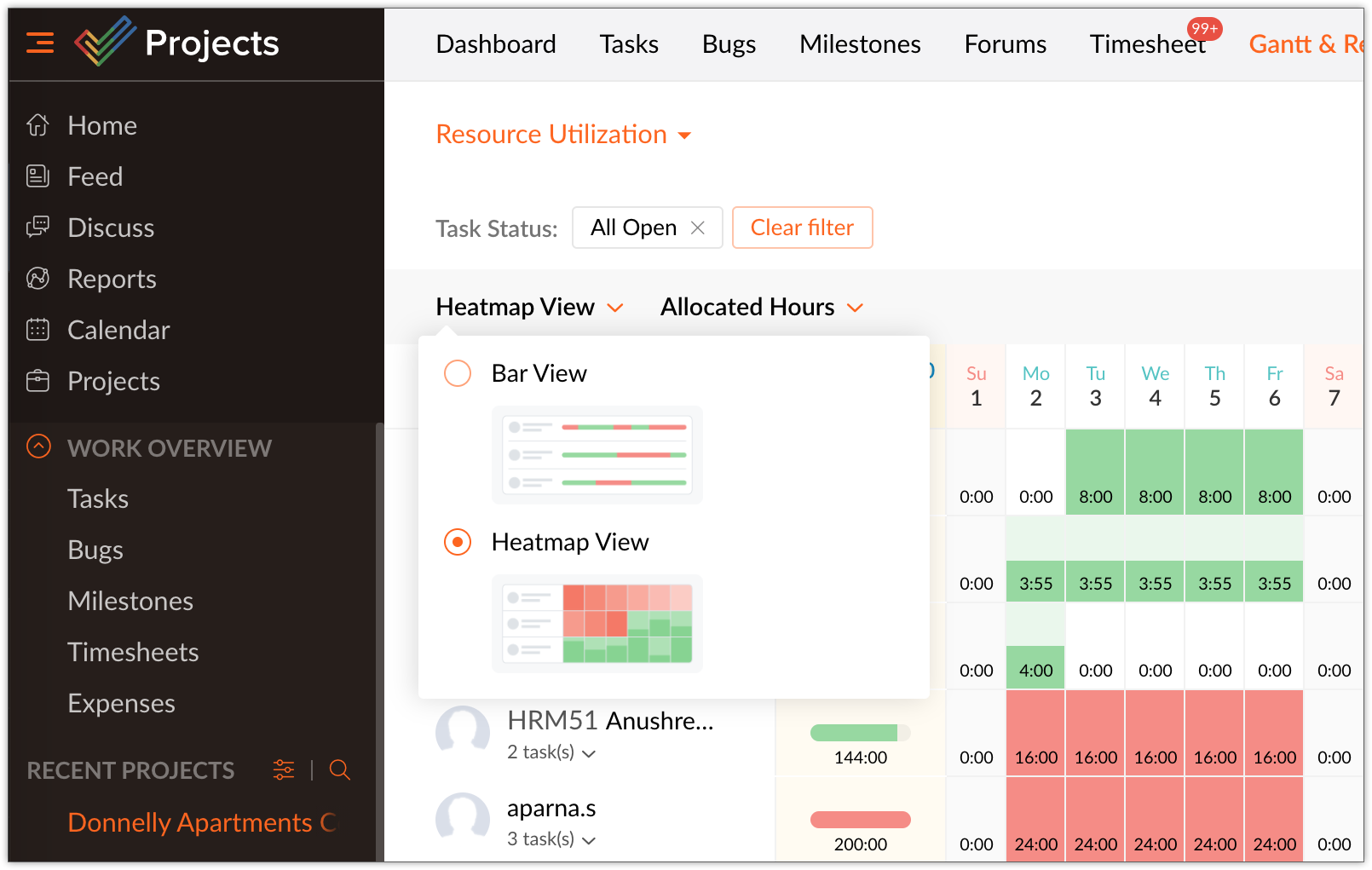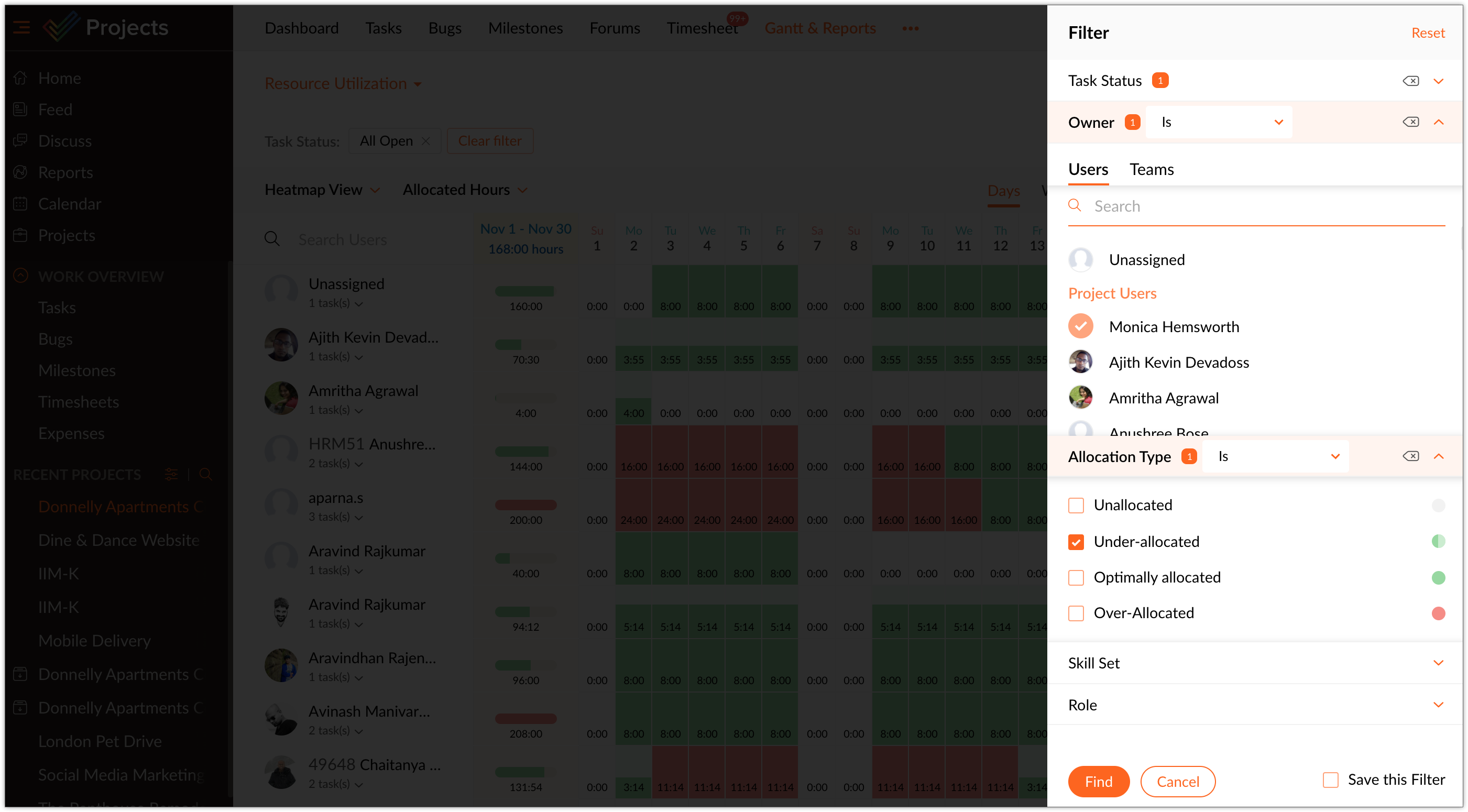 dans le coin supérieur droit pour filtrer les données en fonction des utilisateurs, des équipes, de la période, du type d'allocation, de l'unité de temps de travail, et du statut de la tâche.