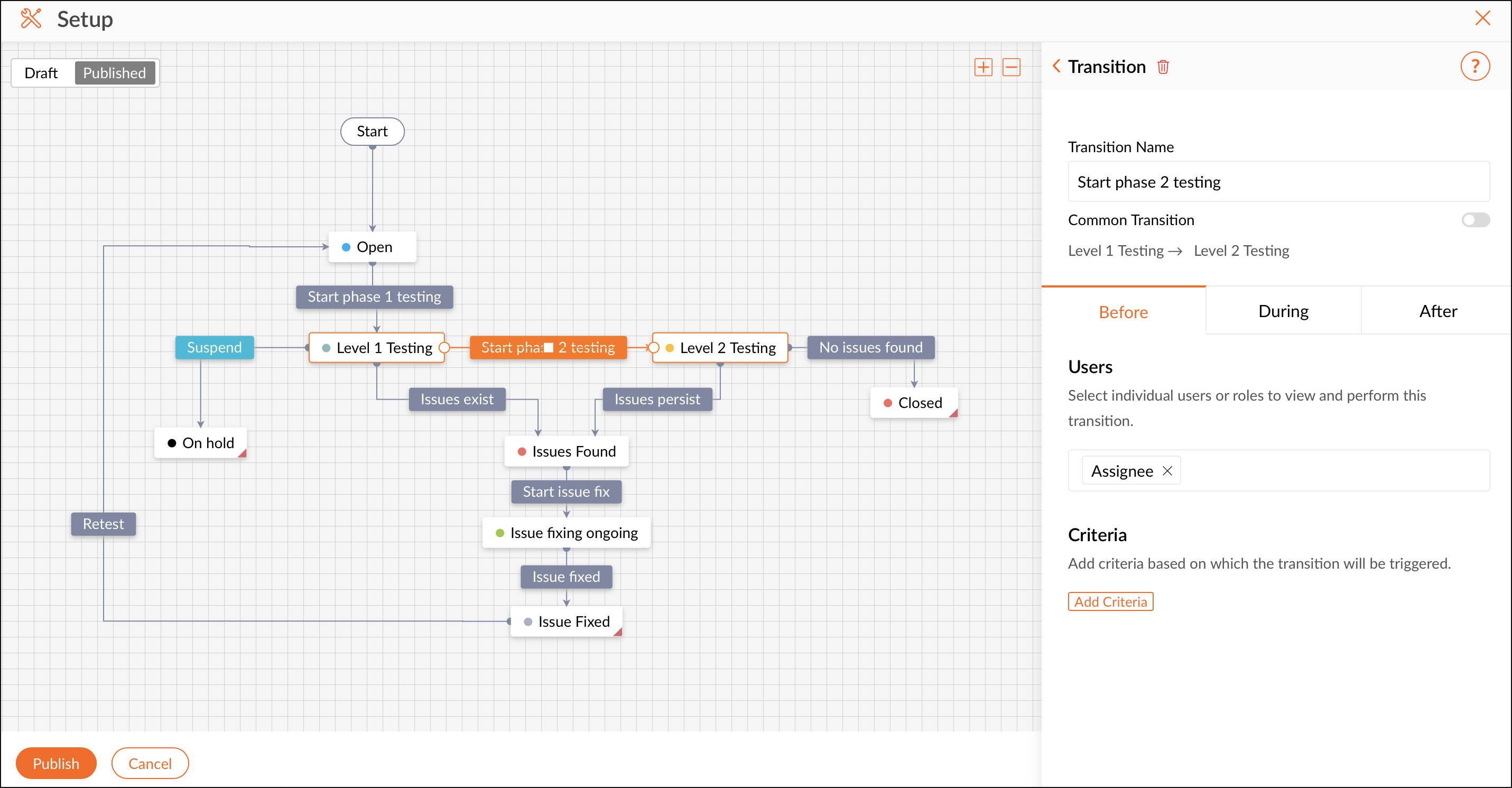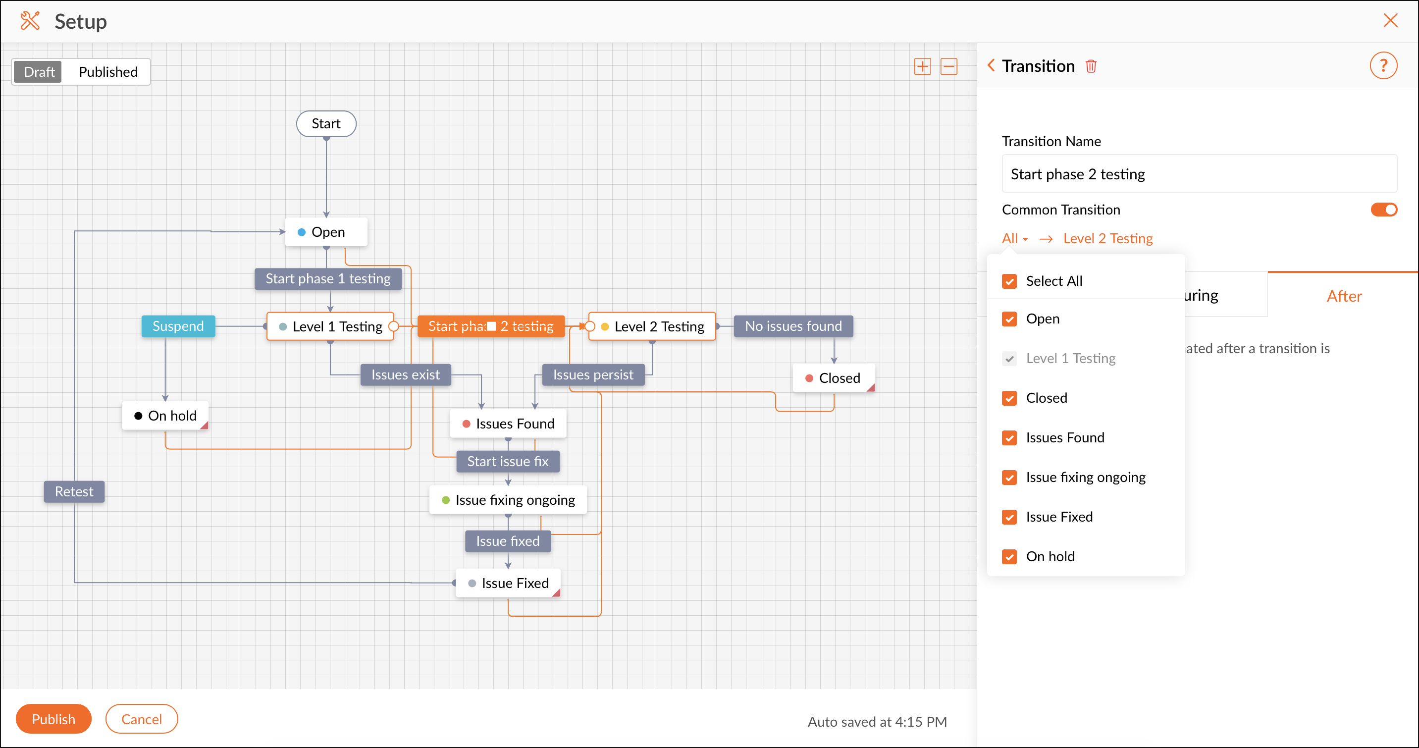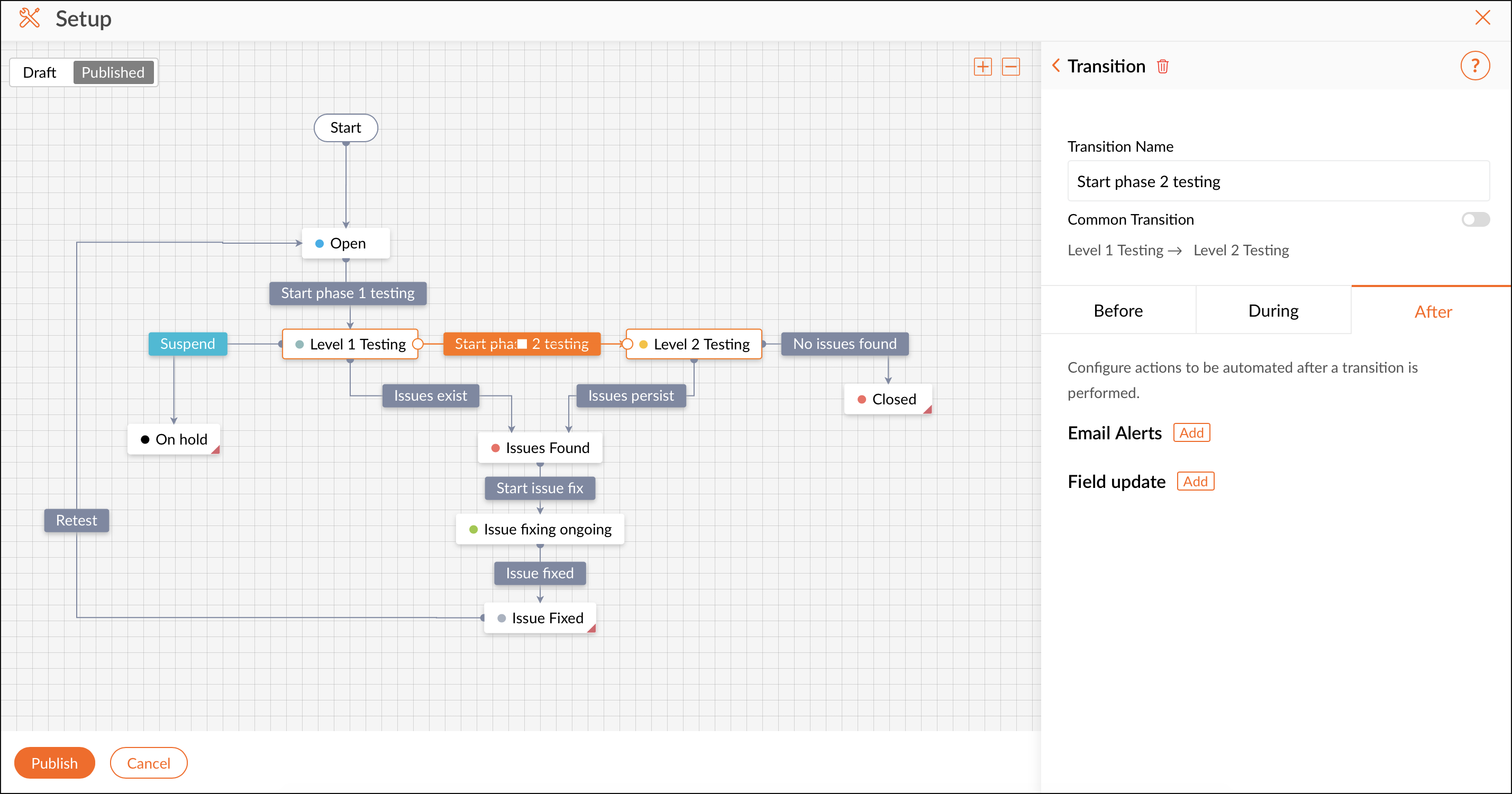 Une fois que tous les statuts et transitions dont vous avez besoin sont configurés, vous pouvez publier le blueprint. Lorsqu'un blueprint est publié, les tâches correspondant aux critères du blueprint suivent le workflow défini dans le blueprint.