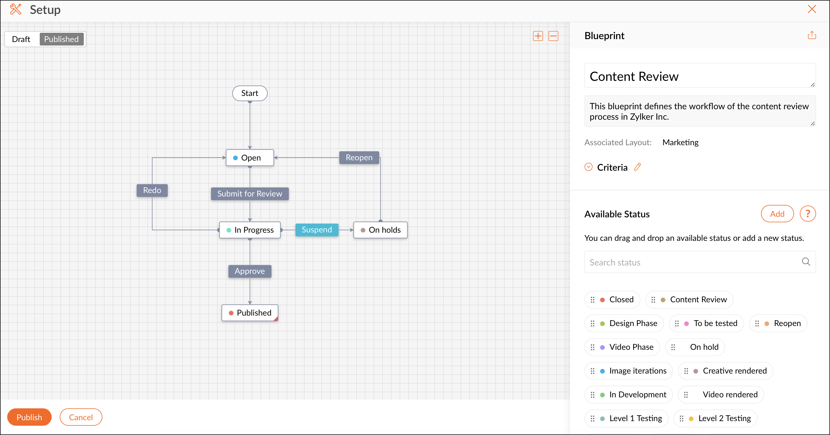 Pour illustrer cela, examinons le workflow du processus de révision de contenu chez Zylker, Inc. La révision de contenu est une tâche attribuée à l'équipe chargée du contenu. Elle utilise Blueprint pour automatiser le workflow du processus de révision. Vous pouvez concevoir un blueprint adapté à votre processus métier.