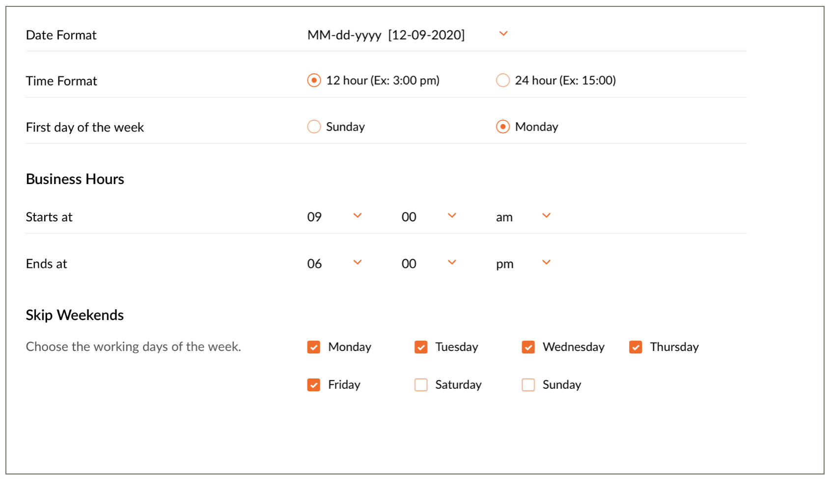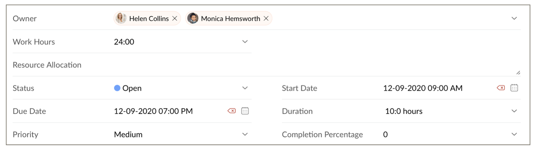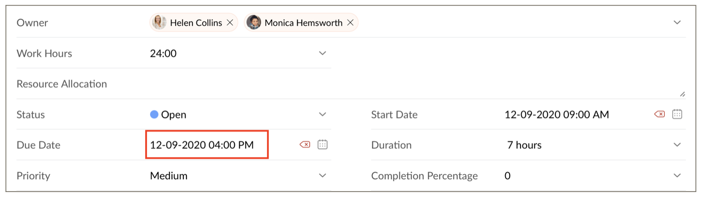 La Date d'échéance d'une tâche est calculée en fonction de sa Date de début et de sa Durée. La Date de début est toujours considérée comme un jour ouvré lorsqu'elle est sélectionnée manuellement, même si elle tombe un week-end ou un jour férié. Cependant, sa Date d'échéance est automatiquement calculée en ignorant le week-end et les jours fériés en fonction des paramètres d’Heures d'ouverture.