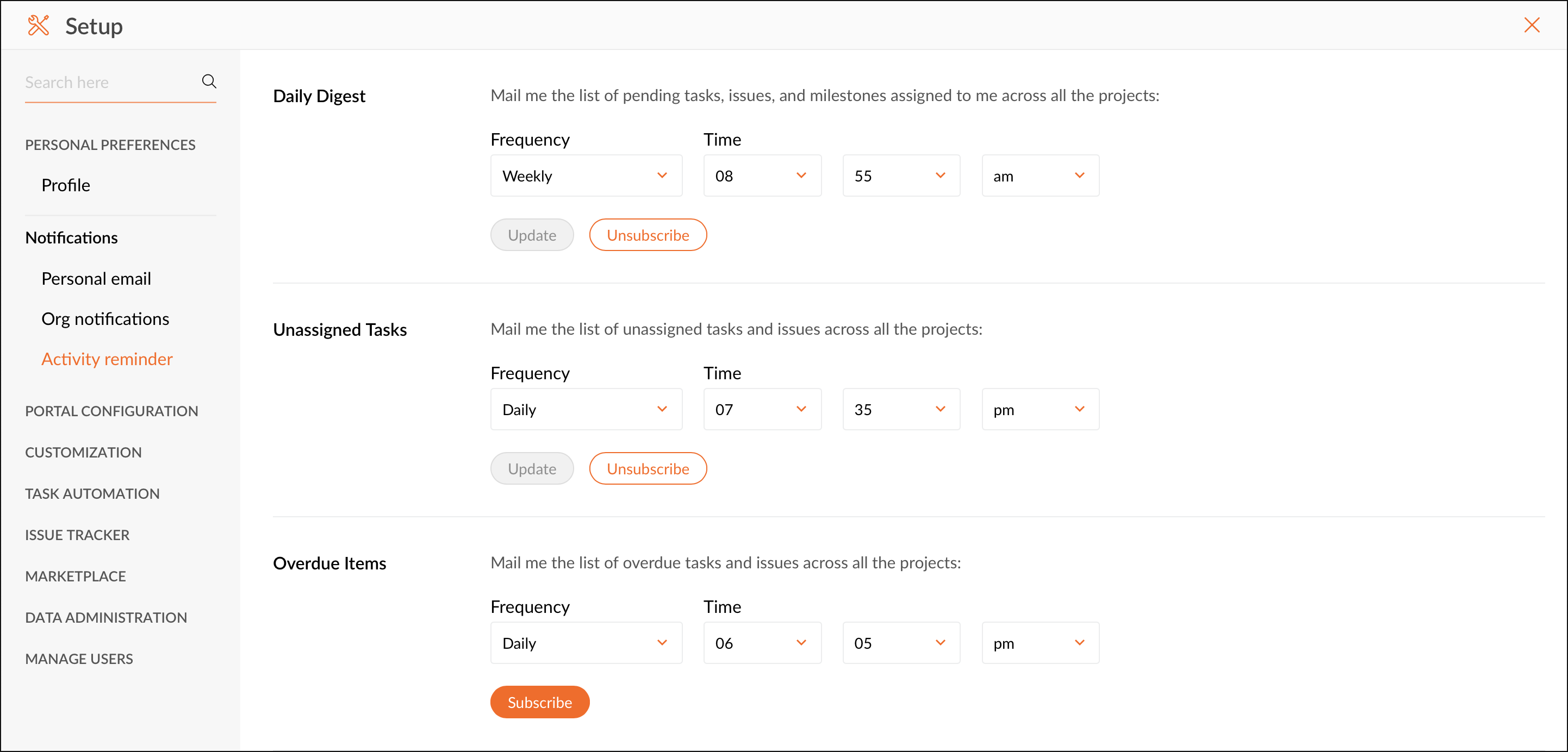 - Sélectionnez heure pour déclencher les e-mails de notification pour les activités en attente et les tâches non attribuées.
