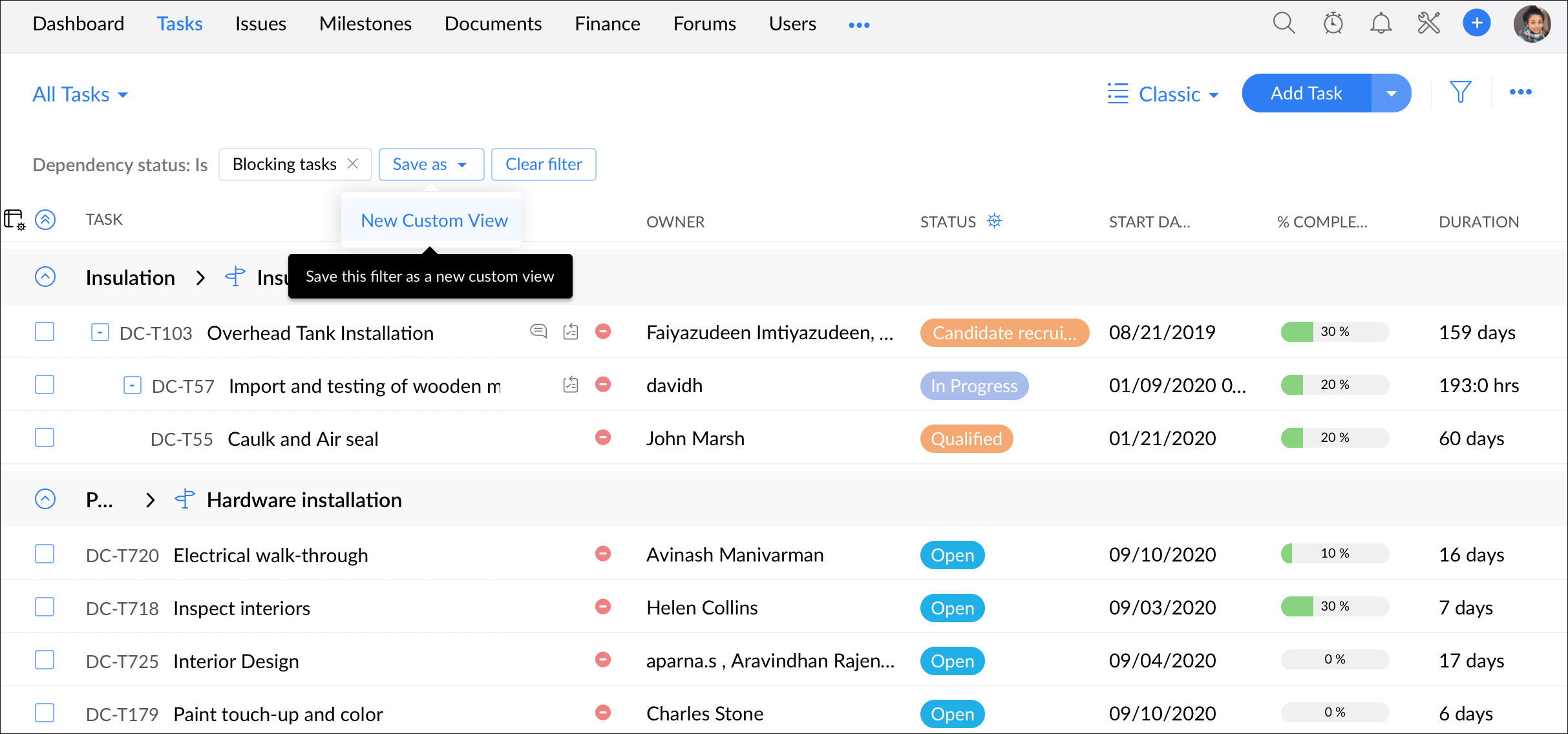 Il est possible de filtrer les tâches par statut de dépendance dans toutes les vues de tâches, mais aussi de les enregistrer en tant que vue personnalisée dans les vues