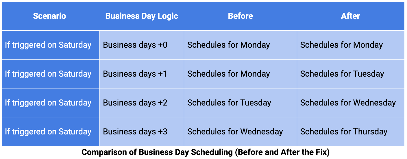This update does not break any workflows. It simply corrects the business-day calculation so schedules behave consistently.