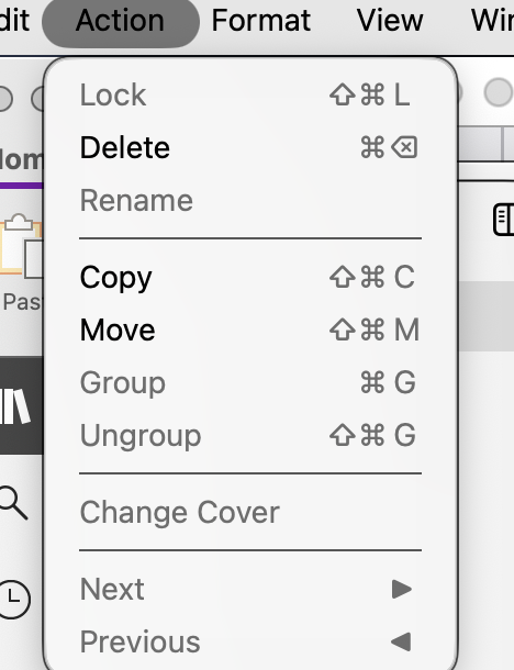 I'm working on an up-to-date Mac with a freshly downloaded Notebook app. I'm trying to rename a group within a notebook. Here I have, left to right, a note, a group, and a note. I select the group. On the top left, I select Action. On the dropdown, "Rename"