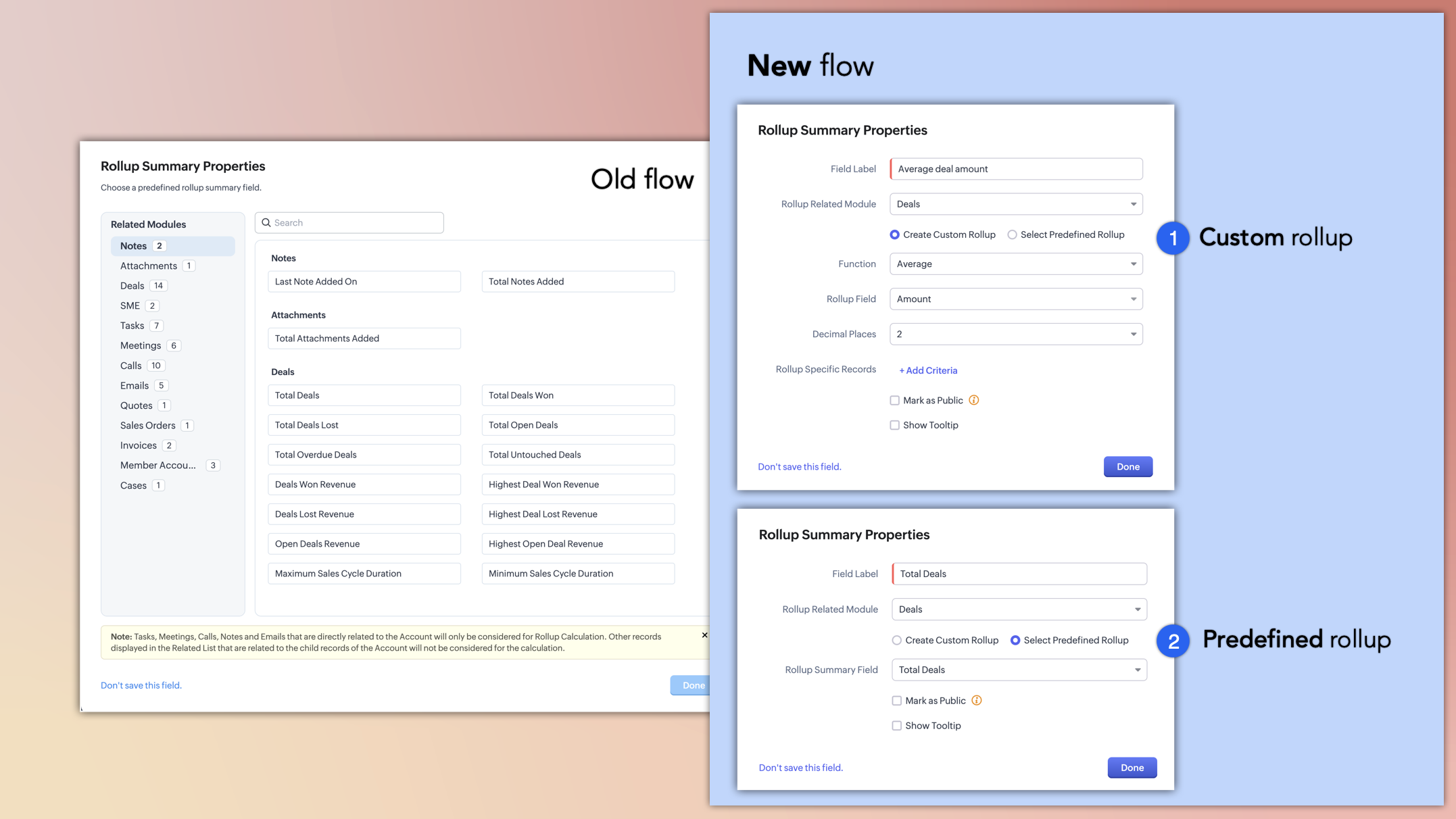 - Rollup fields are available in all modules except Tasks, Calls, Meetings, and Appointments.