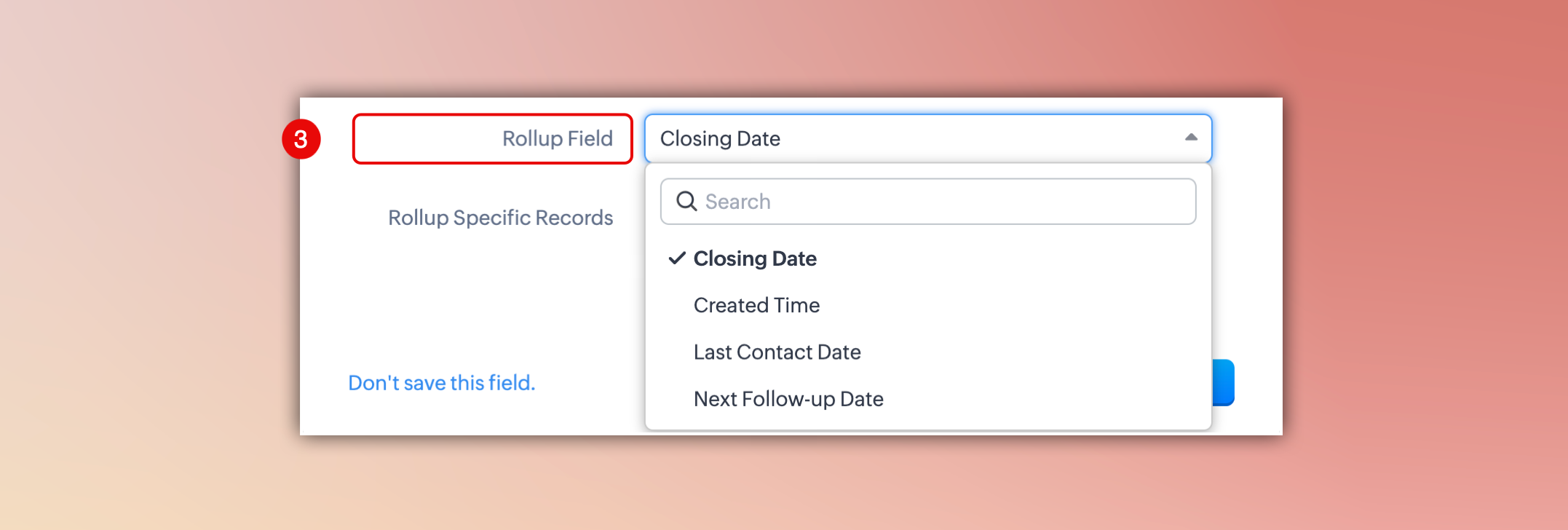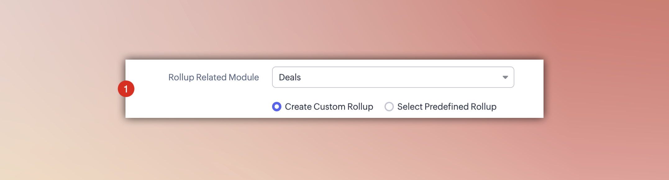 - Rollup related module: Select the related module whose records you want to summarize and choose either to create a custom rollup or use predefined rollup functions.