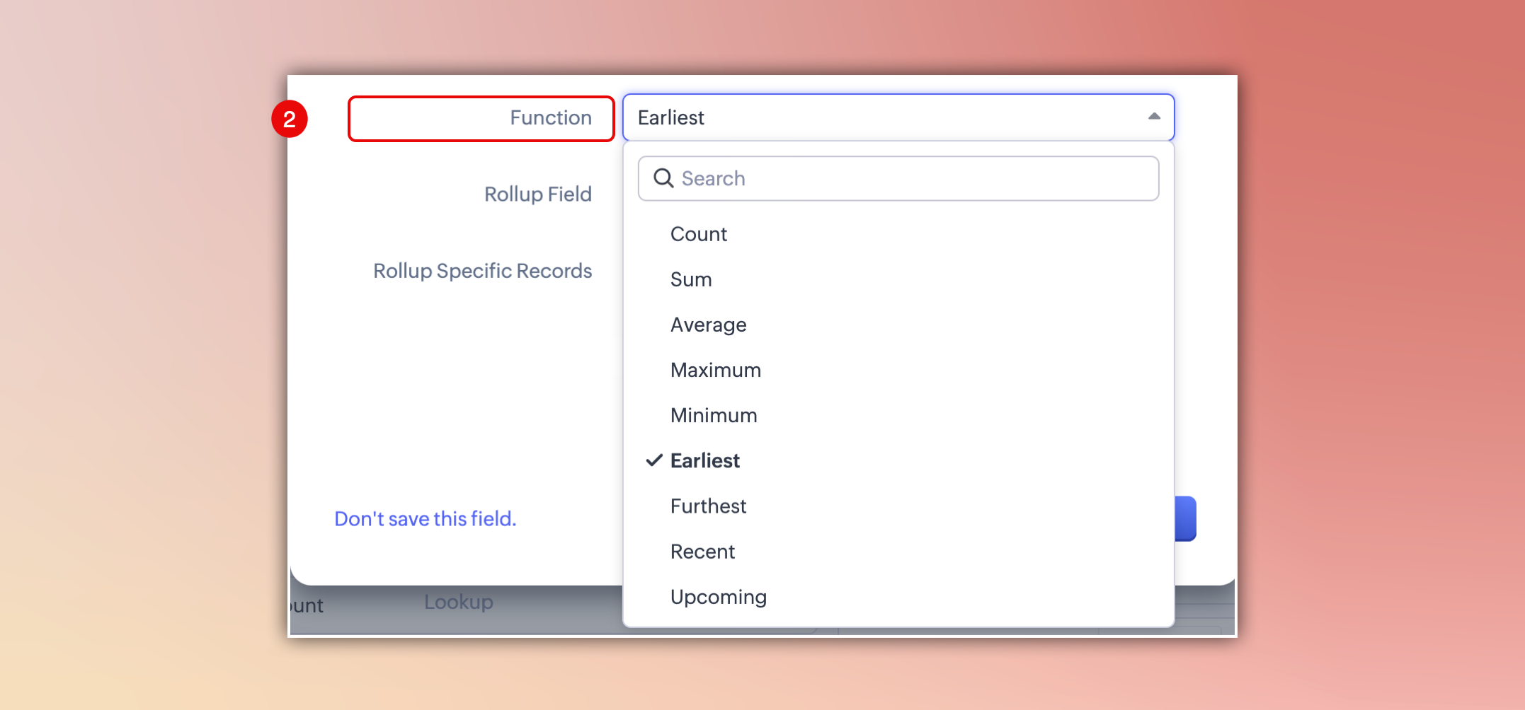 - Rollup field: Based on the selected function, only system-defined and custom fields relevant to that function will be available for selection.