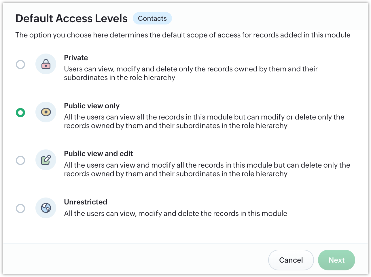 Users with admin permissions can access module-level settings to configure the Default Access Level feature and set access levels for others based on the available options.