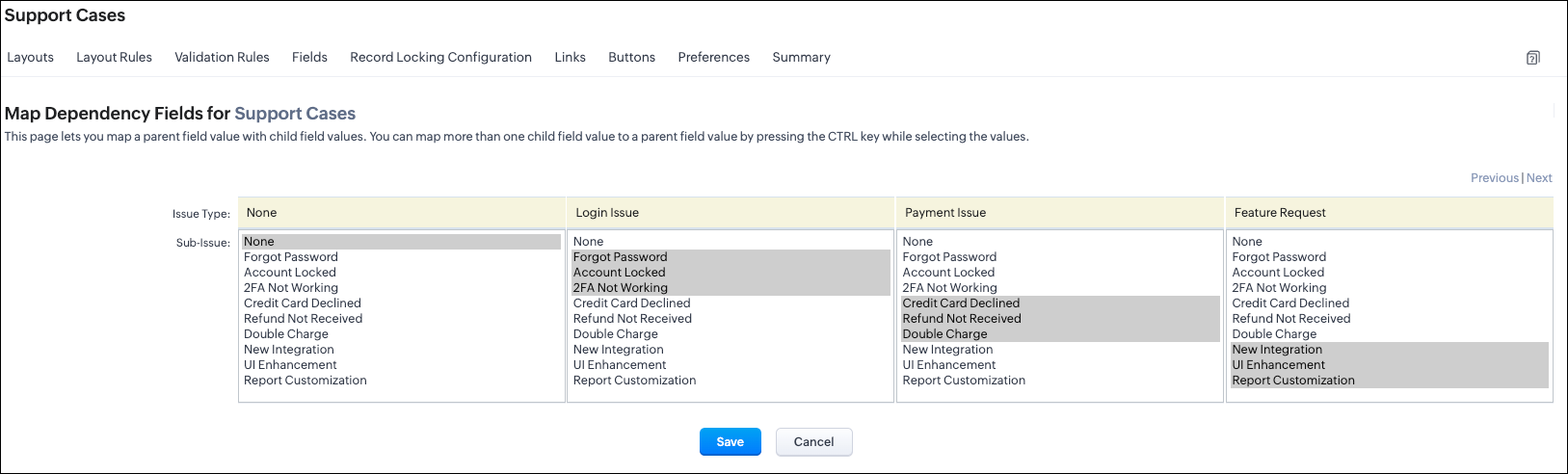 By mapping these fields, CRM users see only the Sub-Issue values relevant to the selected Issue Type.