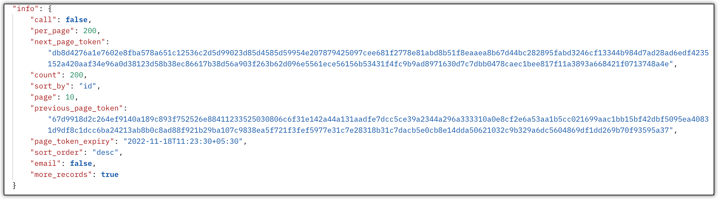 The info JSON object in the response contains the next_page_token to retrieve the next set of records.