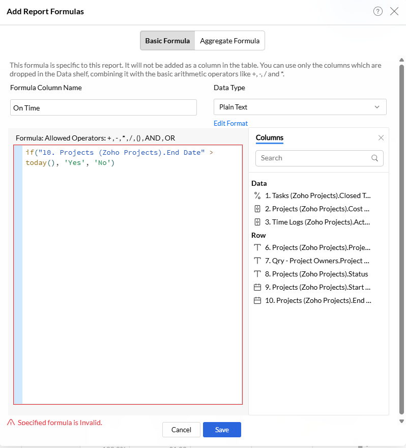 Is it possible for me to use a value of today() in a formula on a pivot table? I'm trying to identify where the end date of a project is greater than the current date if("10. Projects (Zoho Projects).End Date" > today(), 'Yes', 'No') I get the error that