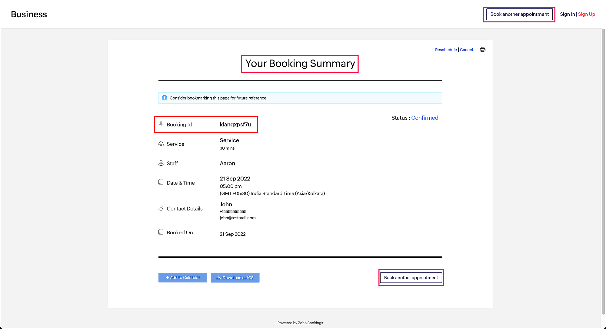 When you sync Zoho Bookings with external calendars, calendar invites will contain the event name as <participant_name> and <service_name> (like Ray Price and Financial Planning) to add more context.