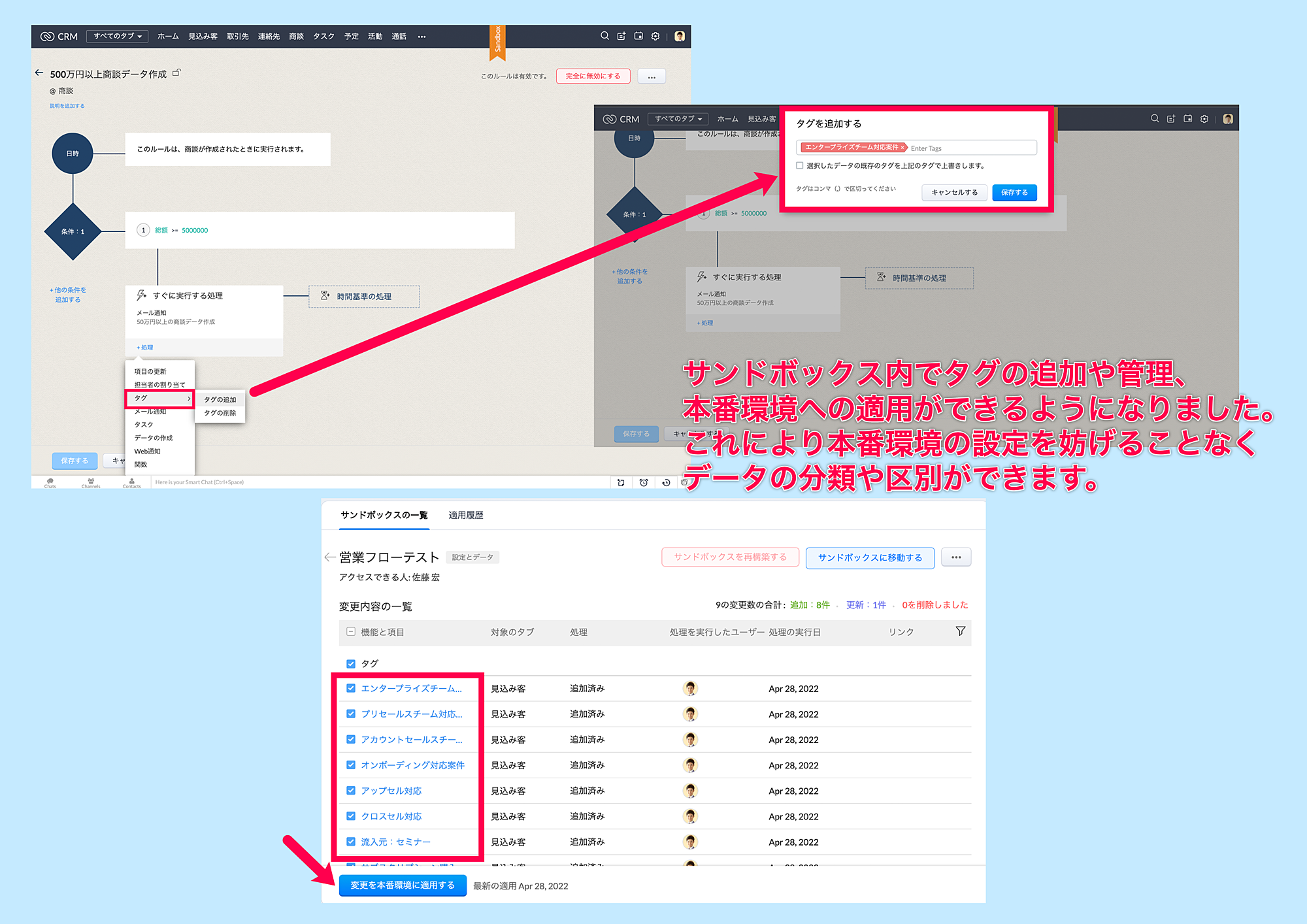これによりサンドボックス内の各タブで、新規タグの作成・追加や既存タグの管理、ワークフロールールやブループリントを使用したデータへ自動でタグを付与することが可能となります。また、サンドボックスから必要なタグを本番環境へ簡単に適用することができます。