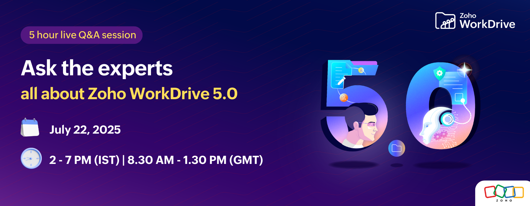 Our product experts will be online to respond to your questions in real time, share insights, and guide you through everything WorkDrive 5.0 has to offer.