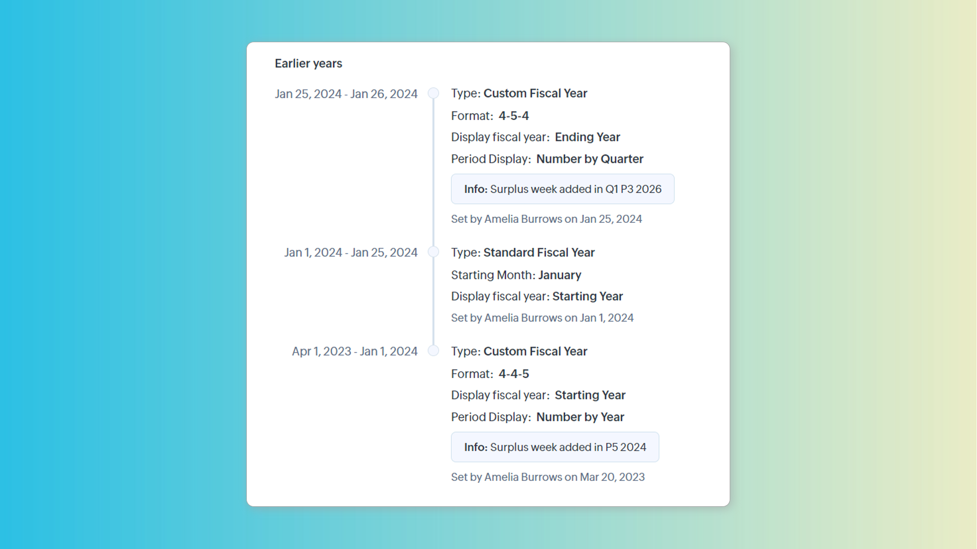 You can also view the history of fiscal year changes in the Fiscal Year tab. For entries with custom fiscal year formats, you can preview them in calendar.
