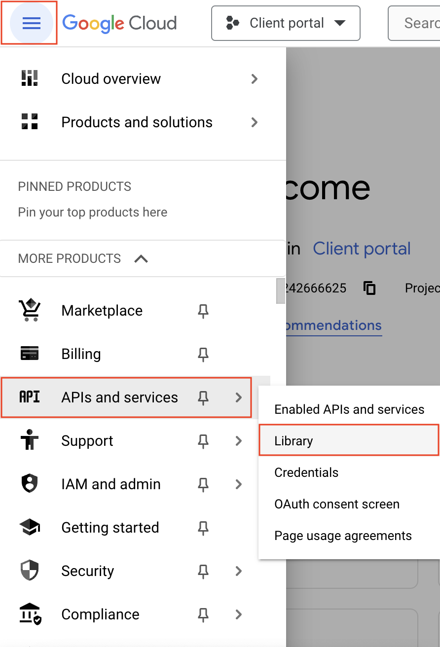 - Navigate to the hamburger menu on the left and click APIs and services -> Library.
