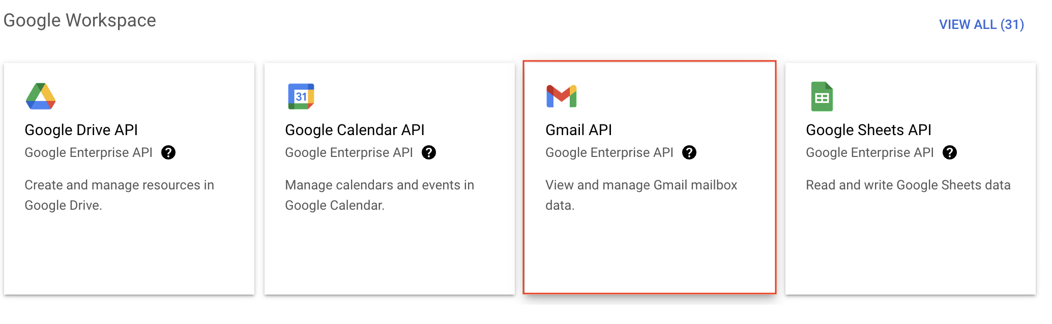 - You'll be taken to the API library page. Navigate to the Google Workspace section and click Gmail API.