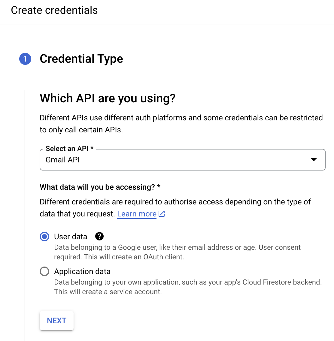 - On the Create credentials page, choose Gmail API in the Select an API dropdown and User Data under the What data will you be accessing? section. Click Next.