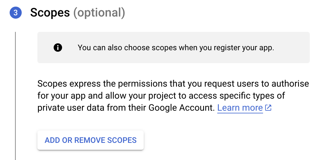 - Next, under the Scopes section, click the ADD OR REMOVE SCOPES button.