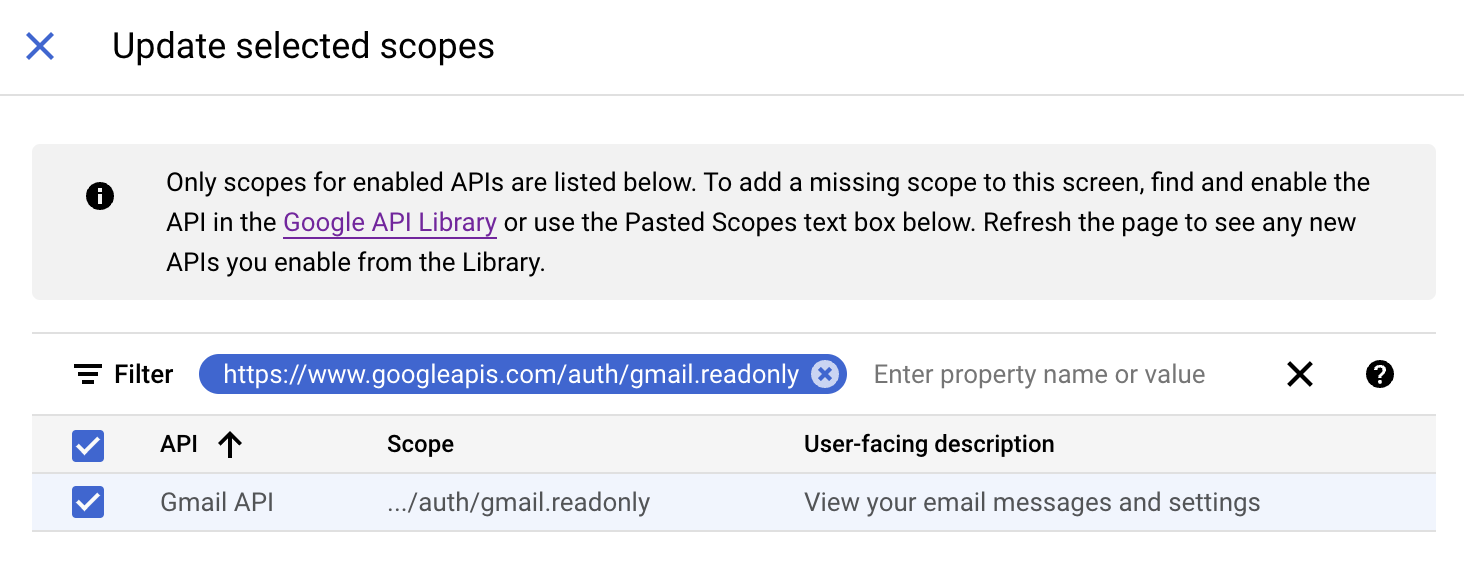 - In the Update selected scopes pane, search and select the gmail.readonly scope. Click Update, and then click Save and continue.