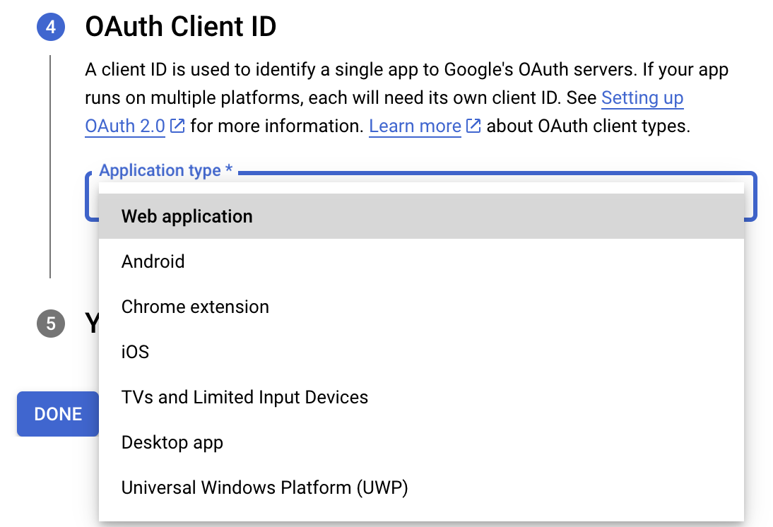 - Now, under the OAuth Client ID section, choose Web application in the Application type dropdown. Then name your app.