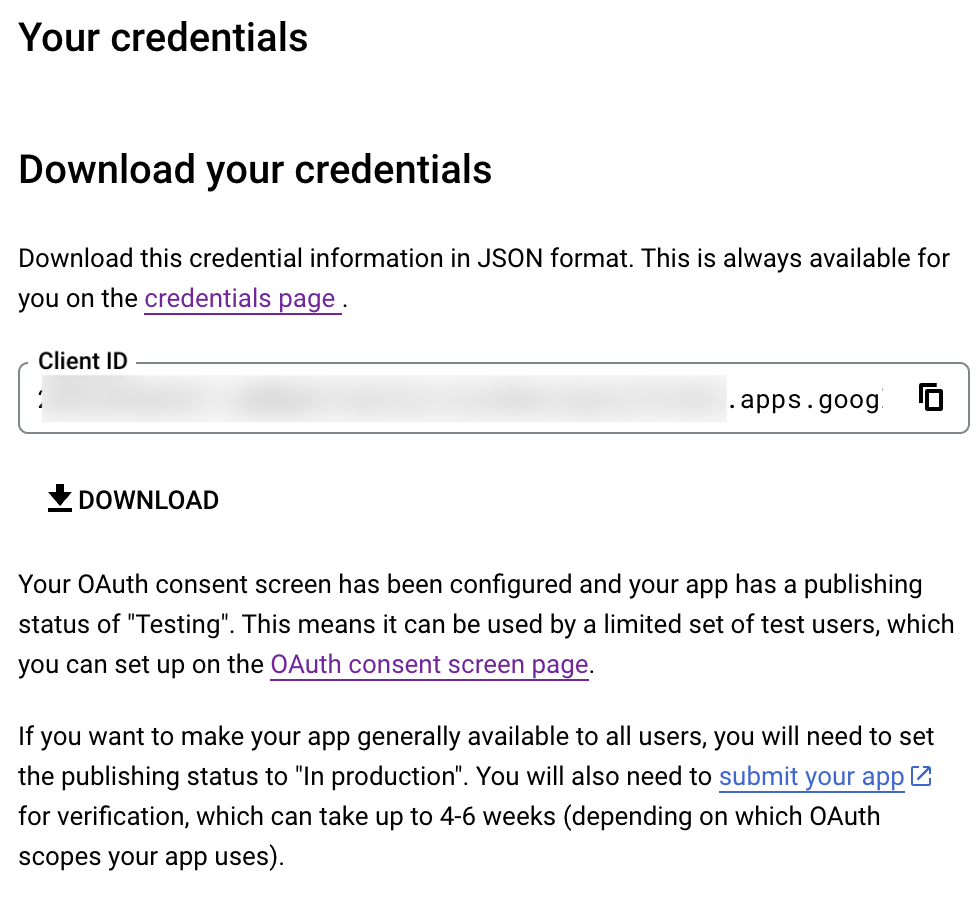 - Click Create and download your credentials. This Client ID and others will be required later, while creating a connection in Zoho CRM.