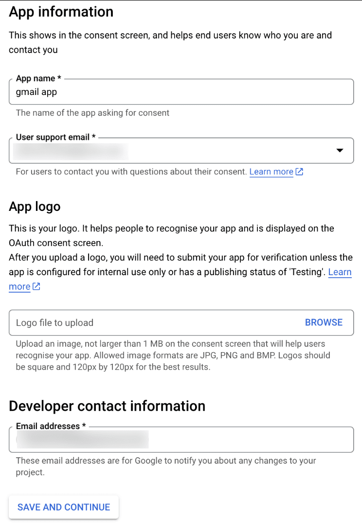 - Next, on the OAuth consent screen, enter the App name, User support email, and Developer contact email address. Then click Save and Continue.