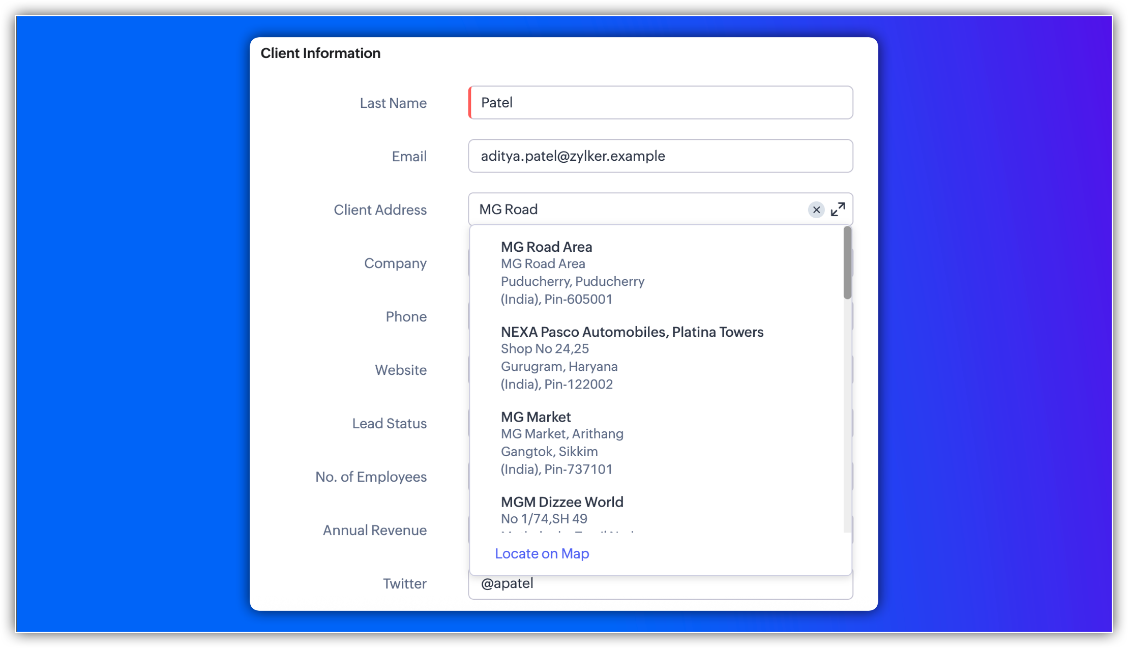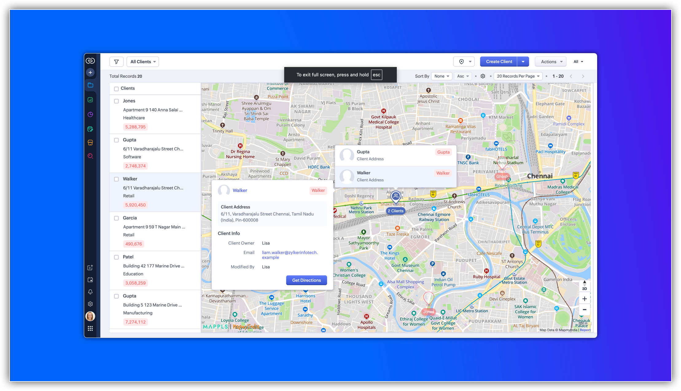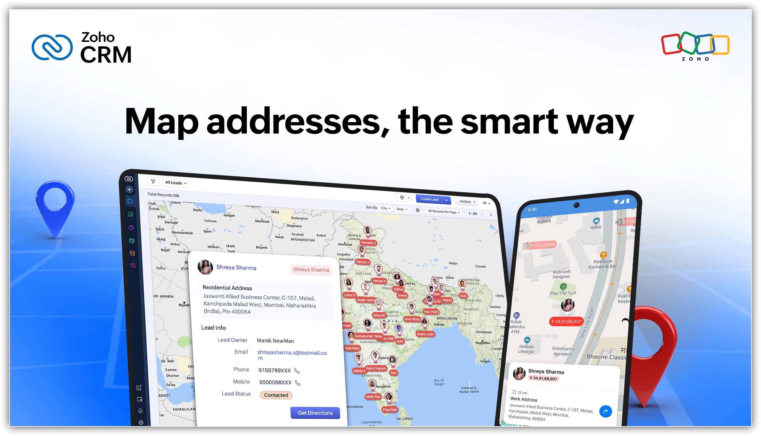 Until now, even if addresses were stored in Zoho CRM, users had to search through lists manually or run broad filters to find location insights. There was no quick way to spot nearby leads, contacts, or other opportunities while traveling, or to plan visits efficiently.
