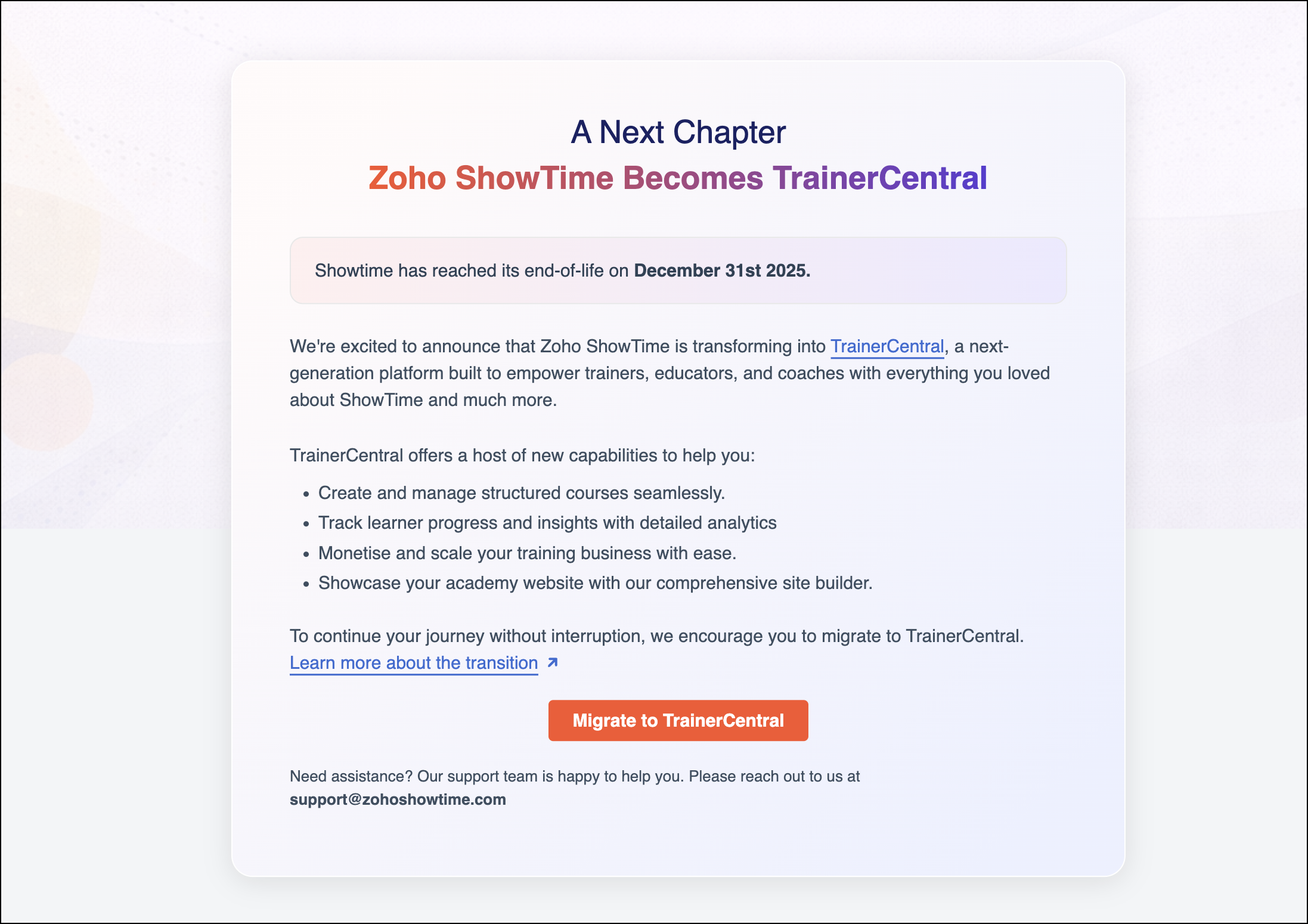 Zoho ShowTime, our online training platform, reached its end of life on December 31, 2025, and its services will be fully shut down on May 30, 2026. We encourage users to migrate to TrainerCentral, our more advanced and feature-rich training platform, with a transition process that can be completed in just a few clicks.