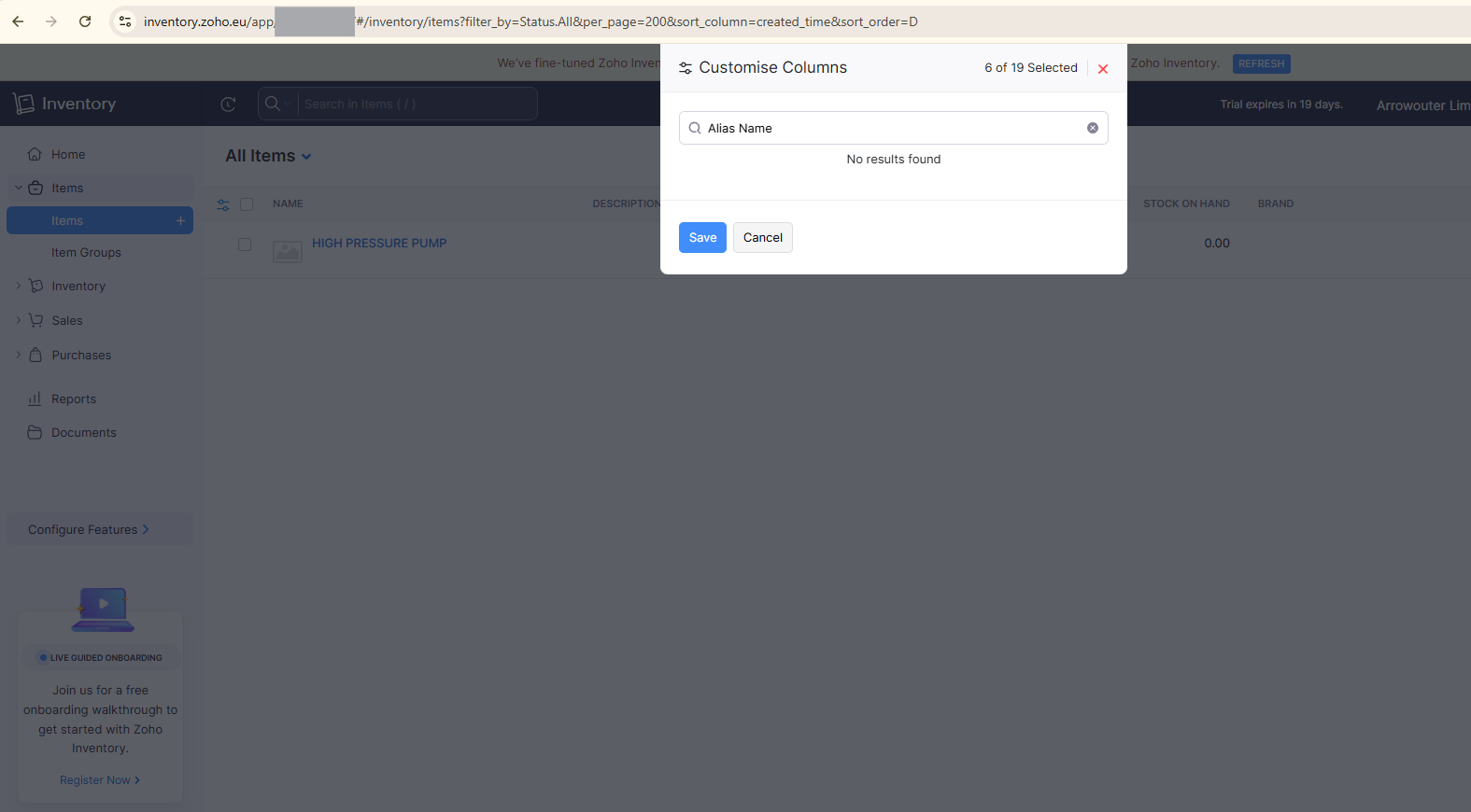 Hi Zoho Inventory Team, I have noticed that the "Alias Name" field does not appear on the list of selectable columns in the Customise Columns feature in the Items module. This would be very useful to see for businesses who are using the Alias Name field