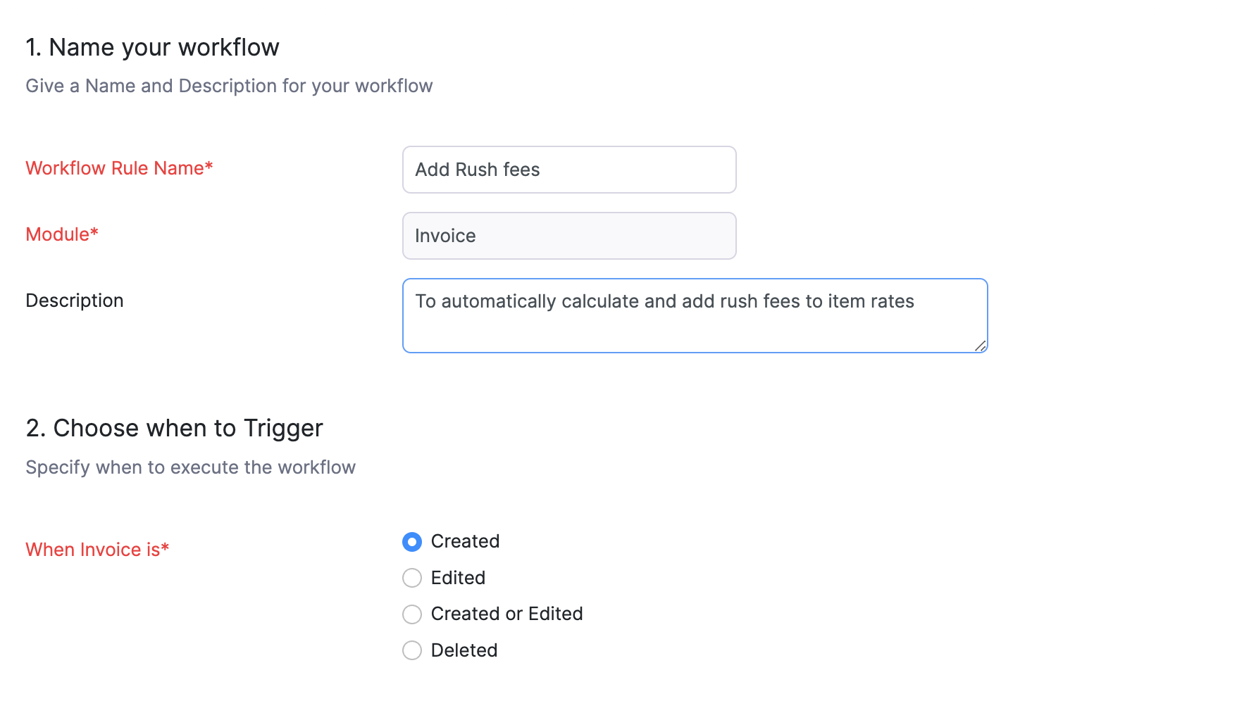 Here's how it works:After creating and saving the invoice as draft, the custom function will be executed. Initially, it copies the original sales rate to the Unit Rate (Custom) field. Then, it calculates the rush fees and adds it to the value in the Unit Rate field. The resultant is displayed in the Rate (Default) field. Following this, Zoho Books performs the calculation of Rate (Default field) * Quantity and fills the result in the Amount field.