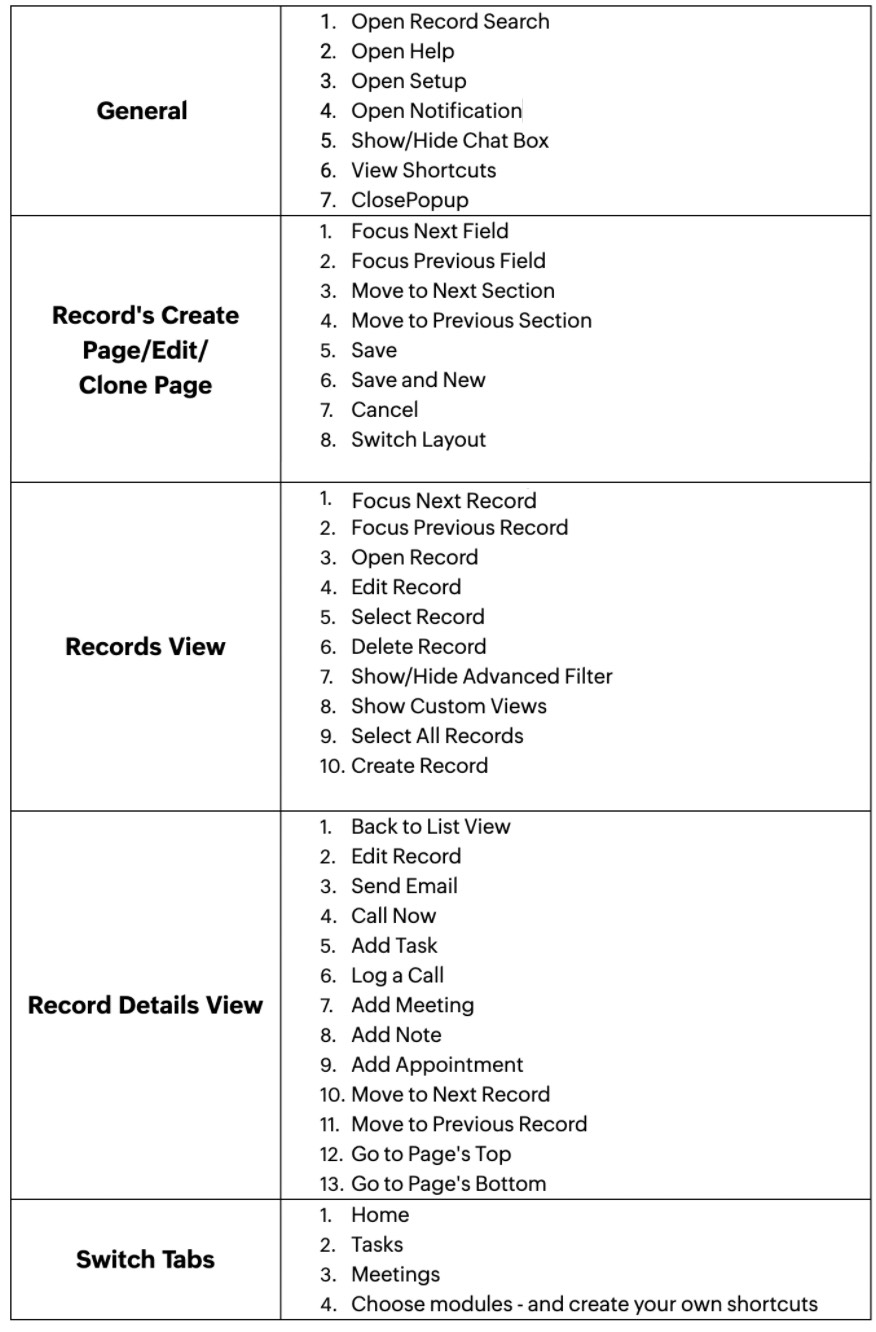 The tables below show the different actions for which Zoho CRM provides shortcuts: