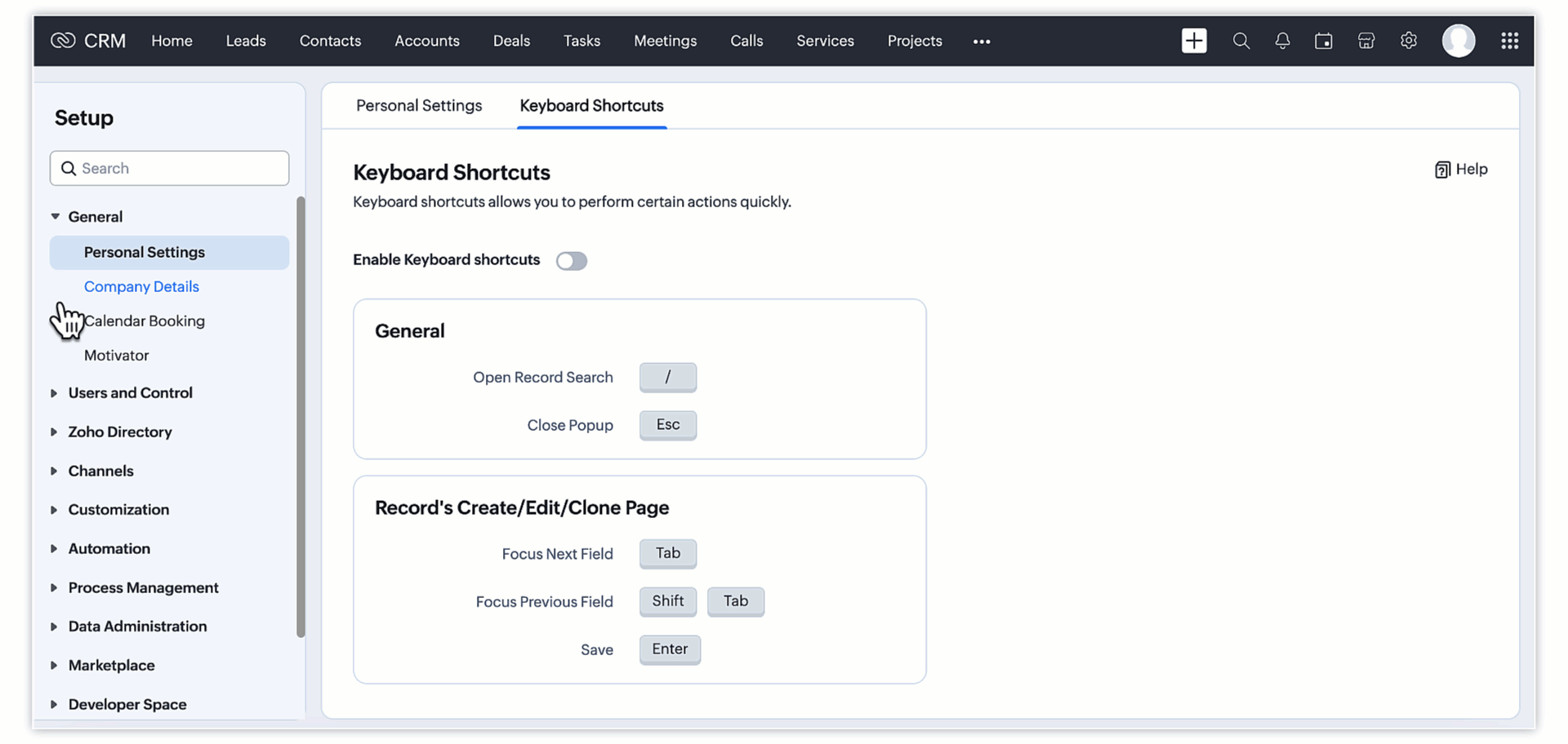 Keyboard shortcuts enable you to perform actions more quickly and efficiently than is possible with just mouse navigation. Using keyboard shortcuts, you can multitask and switch between tabs/modules easily. We've created a set of shortcuts for some of the most common actions in CRM, but these can also be customized to suit user preferences.