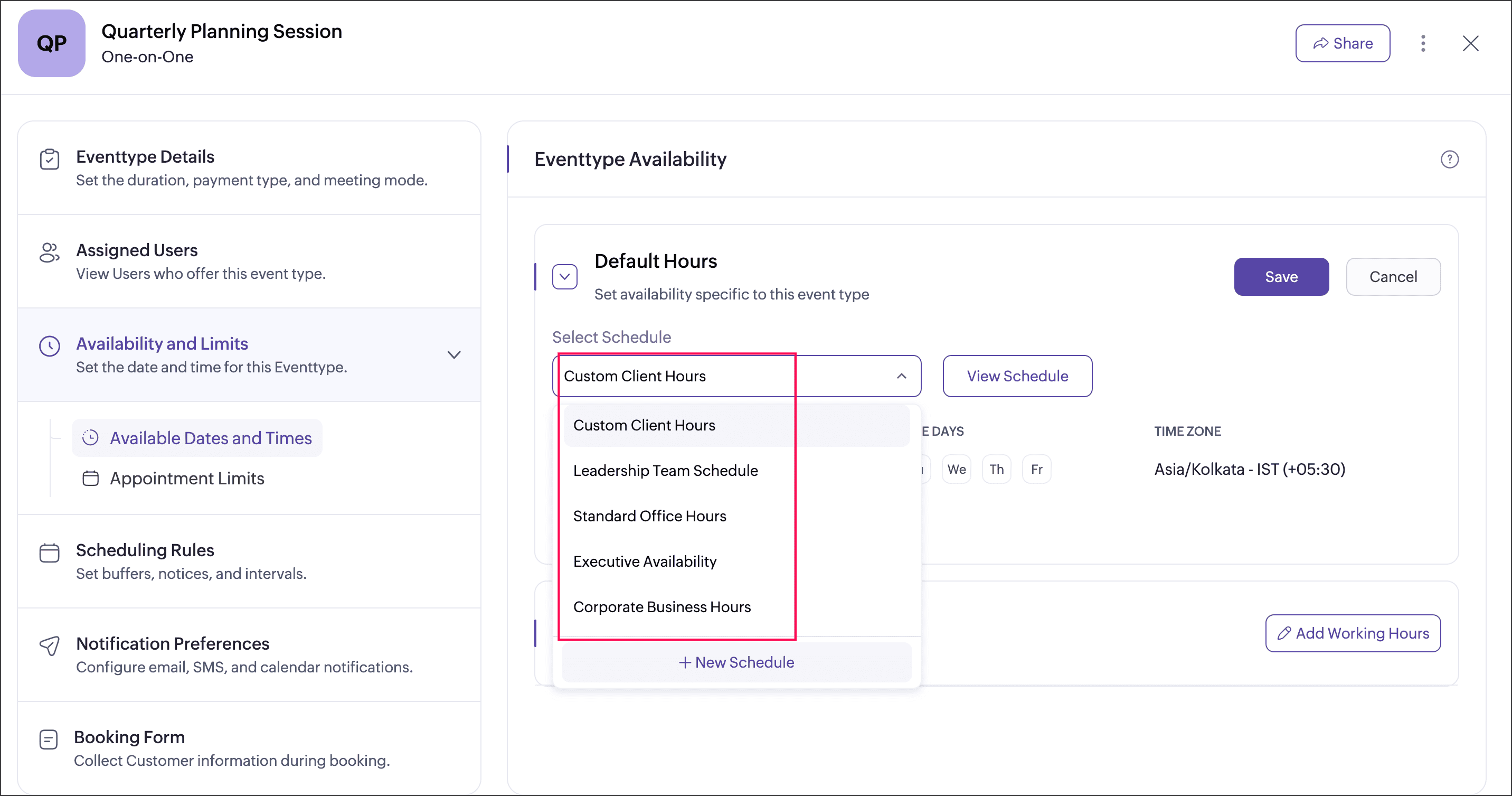 Event type can be assigned with the schedule that has been created at the workspace level, or the event type can be set to follow user working hours.