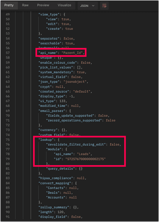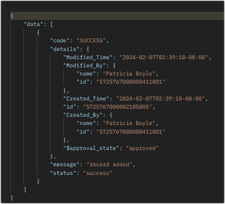 { "data": [ { "Last_Name": "Patricia", "Company": "Info Technology", "Email" : "patricia@mail.com", "Project_Details": //API name of the subform [ { "Project_Name": "Mobile App Development for Productivity", "Project_Type": "Mobile App Development", "Expected_Budget": 50000, "Status": "Negotiation in Process" }, //API names of the subform fields { "Project_Name": "Big Data Infrastructure Implementation", "Project_Type": "Infrastructure Upgrade", "Expected_Budget": 30000, "Status": "Proposal Submitted" }, { "Project_Name": "Big Data Infrastructure Implementation", "Project_Type": "Infrastructure Upgrade", "Expected_Budget": 30000, "Status": "Proposal Submitted" } ] } ] } |