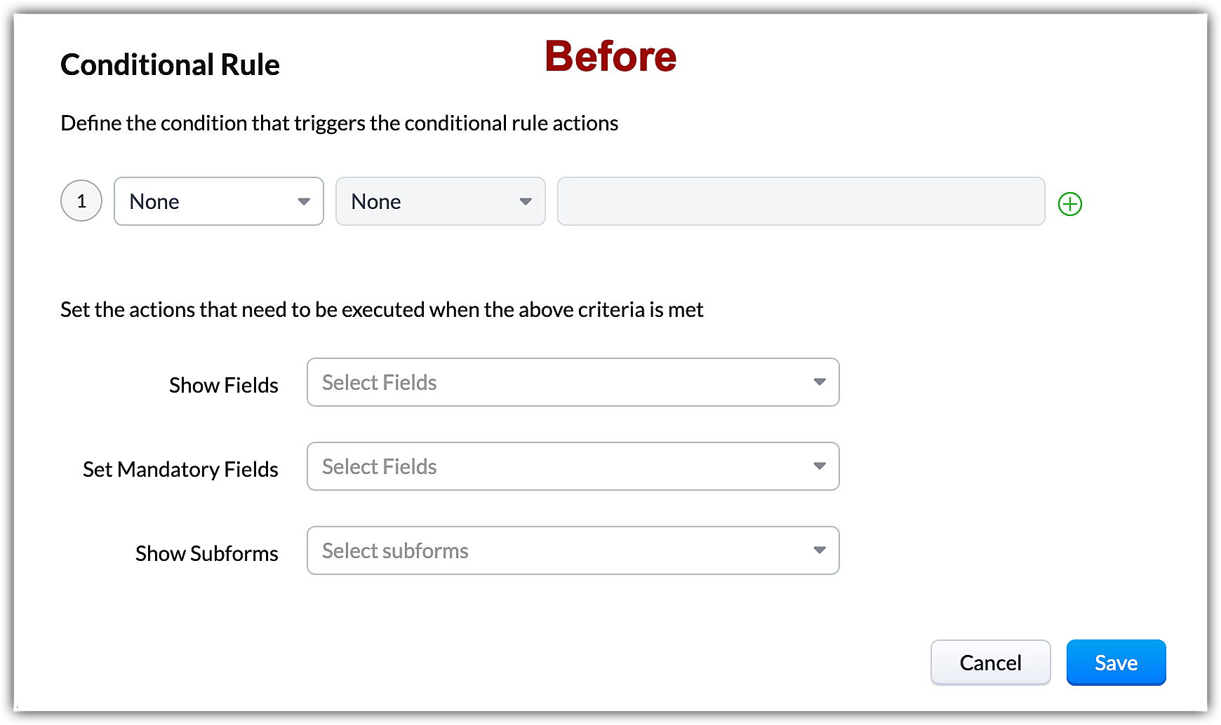 We have always provided the options for setting up conditional rules while creating a wizard such that if the specified condition is met, you could choose to show only specific fields in the wizard, set mandatory fields, and choose from the list of subforms to show.