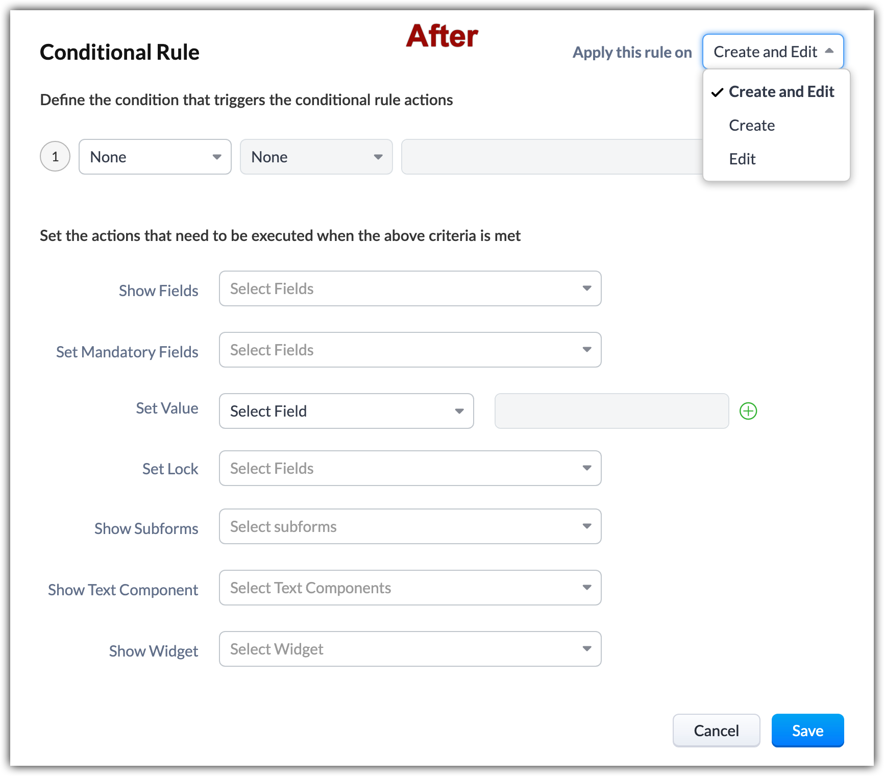 You can now select whether the conditional rules will be applied only when the wizard is created, or edited, or either of them.