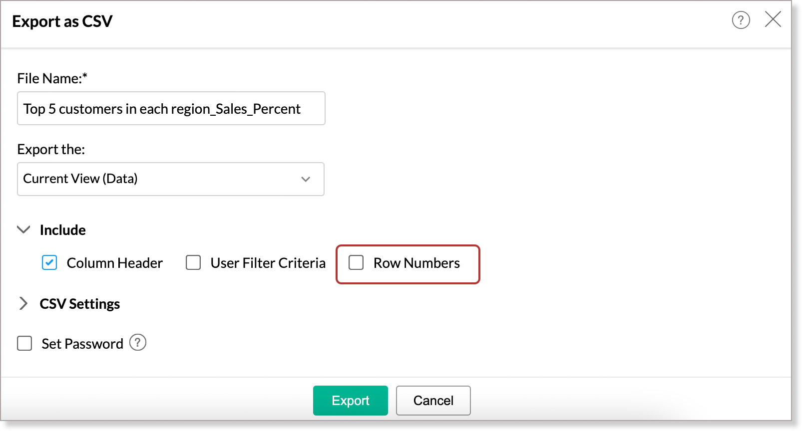 Now you can add a row number column to your tabular reports while exporting data. This option will auto generate sequential numbers for all the exported rows.
