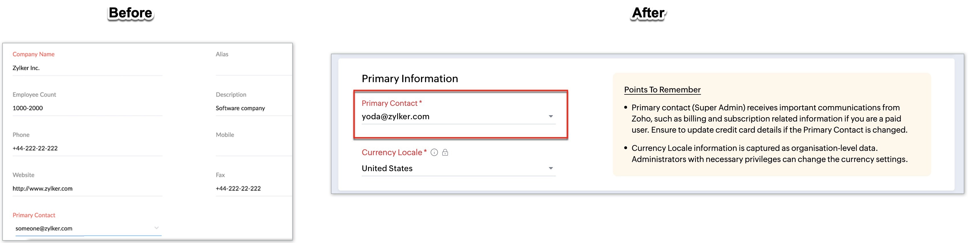 The Zoho Desk team determined these changes would help enhance clarity and simplify navigation by logically grouping related information. By having separate sections for Profile, Primary Information, and Address Details, users can easily manage their company information and ensure a smoother experience when updating or comparing details.