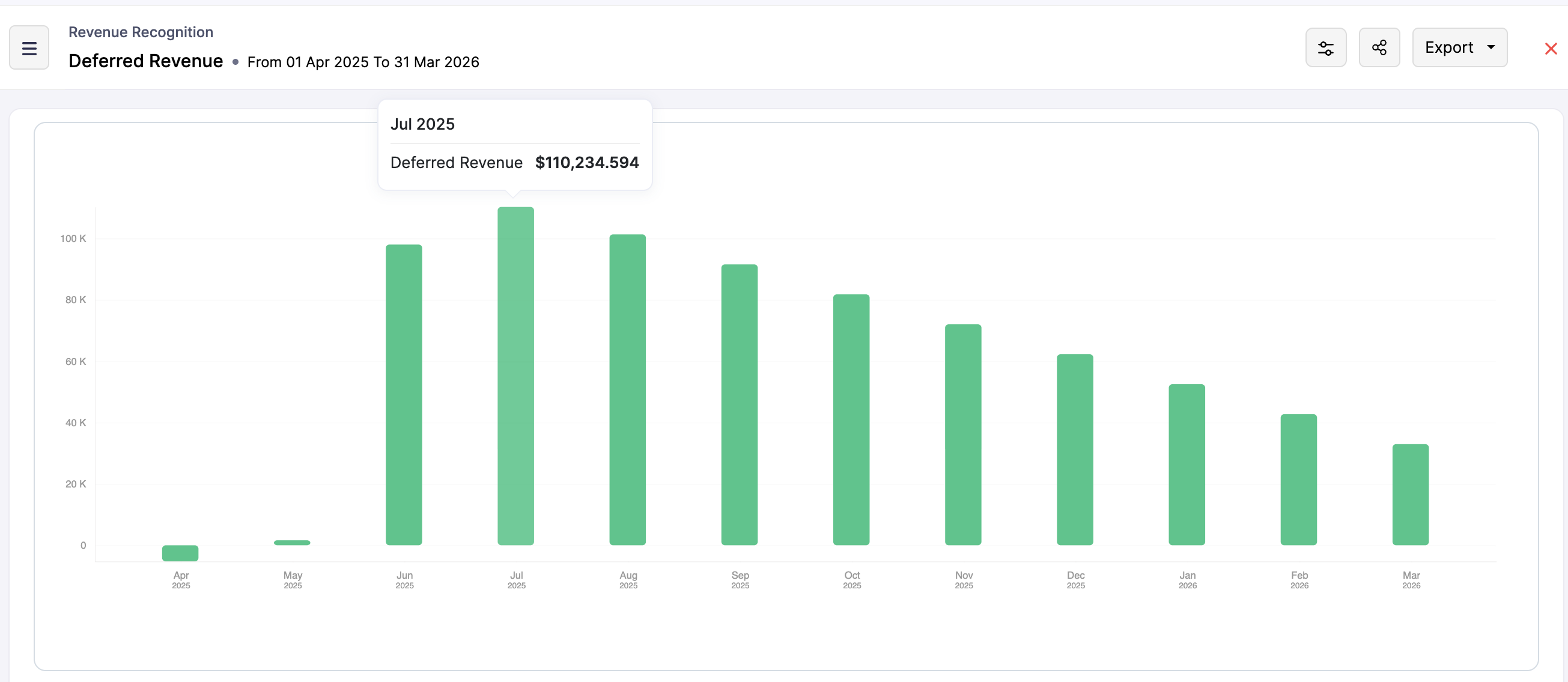 Revenue Waterfall Report: This report visualizes the flow of revenue over time, showing how deferred revenue transitions to recognized revenue. It provides a timeline of revenue recognition, offering insights into trends and future earnings.