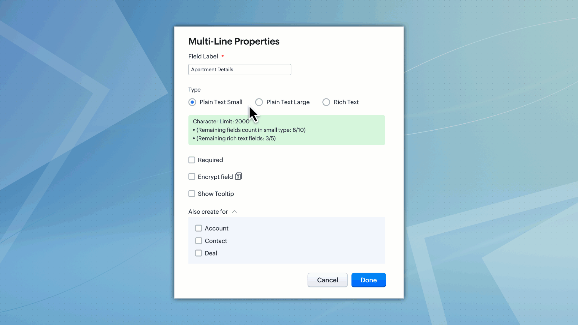 - Expanded character options: Previously, you had to select between a 2,000-character or 32,000-character limit for multi-line fields. We've now simplified this by introducing a radio button with three options: plain text small, plain text large, and rich text.