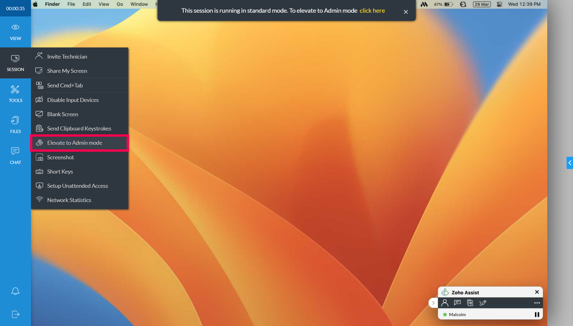 Navigate to Session in Technician Console and select Elevate to Admin Mode. A prompt appears on the remote Mac asking for admin credentials.