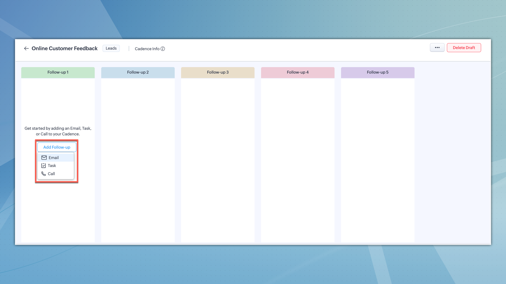 You can configure the first follow-up as either an email, task, or call. You can also choose when the first follow-up should be triggered.